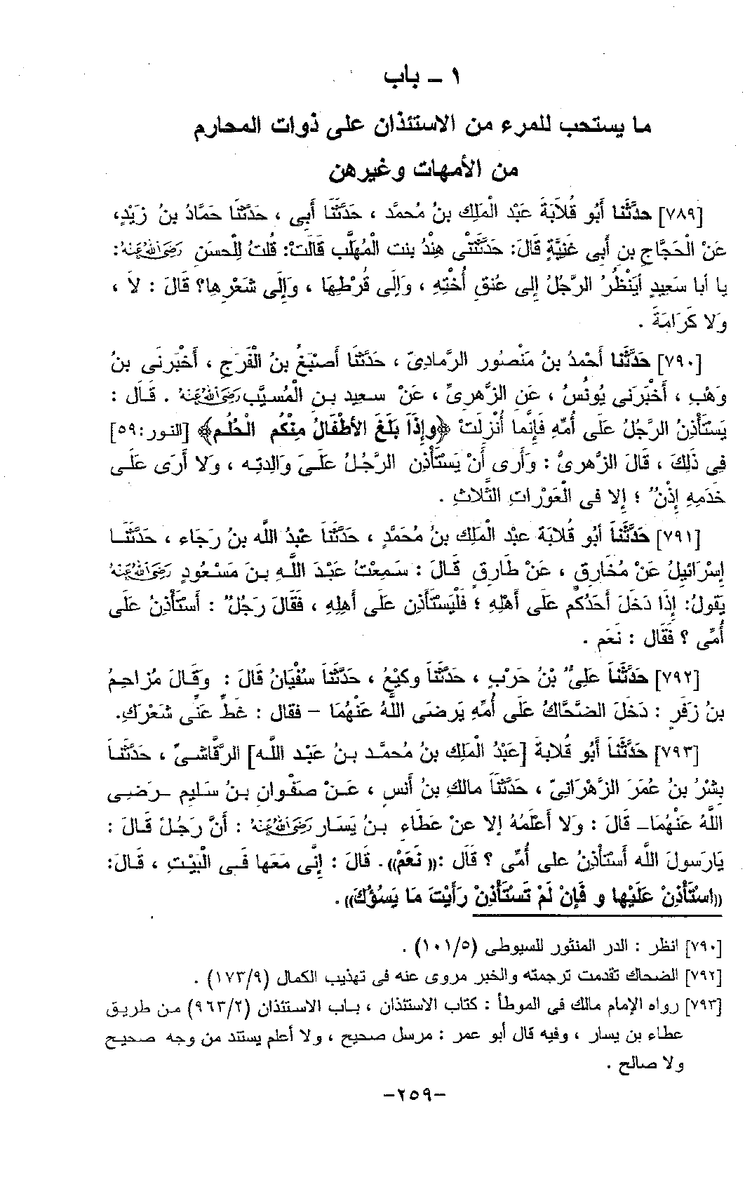 793 - حَدَّثَنَا أَبُو قِلَابَةَ عَبْدُ الْمَلِكِ بْنُ مُحَمَّدِ بْنِ عَبْدِ اللَّهِ الرَّقَاشِيُّ، حَدَّثَنَا بِشْرُ بْنُ عُمَرَ الزَّهْرَانِيُّ، حَدَّثَنَا مَالِكُ بْنُ أَنَسٍ، عَنْ صَفْوَانَ بْنِ سُلَيْمٍ، رَضِيَ اللَّهُ عَنْهُمَا قَالَ: وَلَا أَعْلَمُهُ إِلَّا عَنْ عَطَاءِ بْنِ يَسَارٍ رَضِيَ اللَّهُ عَنْهُ " أَنَّ رَجُلًا قَالَ: يَا رَسُولَ اللَّهِ، §أَسْتَأْذِنُ عَلَى أُمِّي؟ قَالَ: نَعَمْ قَالَ: إِنِّي مَعَهَا فِي الْبَيْتِ؟ قَالَ: اسْتَأْذِنْ عَلَيْهَا، فَإِنْ لَمْ تَسْتَأْذِنْ رَأَيْتَ مَا يَسُوؤُكَ "