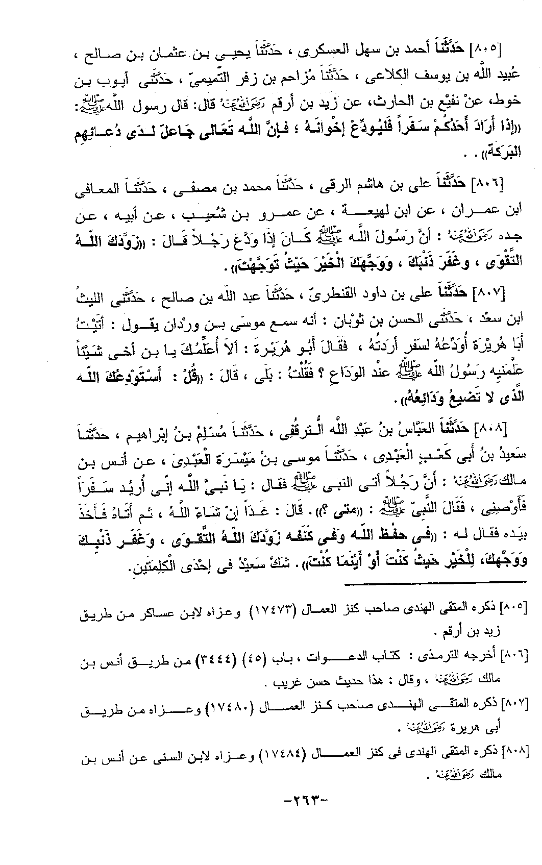 805 - حَدَّثَنَا أَحْمَدُ بْنُ سَهْلٍ الْعَسْكَرِيُّ، حَدَّثَنَا يَحْيَى بْنُ عُثْمَانَ بْنِ صَالِحٍ، عَنْ عَبْدِ اللَّهِ بْنِ يُوسُفَ الْكَلَاعِيِّ، حَدَّثَنَا مُزَاحِمُ بْنُ زُفَرَ التَّيْمِيُّ، حَدَّثَنِي أَيُّوبُ بْنُ خُوطٍ، عَنْ نُفَيْعِ بْنِ الْحَارِثِ، عَنْ زَيْدِ بْنِ أَرْقَمَ، رَضِيَ اللَّهُ عَنْهُ قَالَ: قَالَ رَسُولُ اللَّهِ صَلَّى اللَّهُ عَلَيْهِ وَسَلَّمَ: «§إِذَا أَرَادَ أَحَدُكُمْ سَفَرًا، فَلْيُوَدِّعْ إِخْوَانَهُ؛ فَإِنَّ اللَّهَ تَعَالَى جَاعِلٌ لَدَى دُعَائِهِمُ الْبَرَكَةَ»