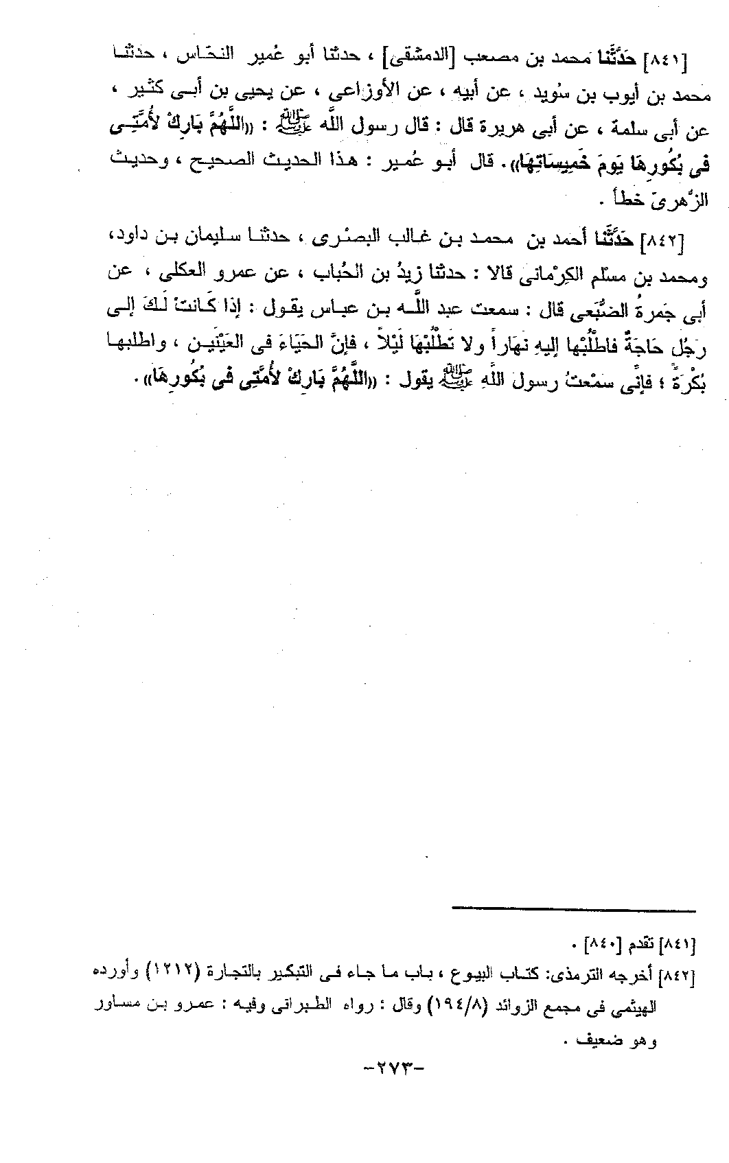 841 - حَدَّثَنَا مُحَمَّدُ بْنُ مُصْعَبٍ الدِّمَشْقِيُّ، حَدَّثَنَا أَبُو عُمَيْرٍ النَّحَّاسُ، حَدَّثَنَا مُحَمَّدُ بْنُ أَيُّوبَ بْنِ سُوَيْدٍ، عَنْ أَبِيهِ، عَنِ الْأَوْزَاعِيِّ، عَنْ يَحْيَى بْنِ أَبِي كَثِيرٍ، عَنْ أَبِي سَلَمَةَ، عَنْ أَبِي هُرَيْرَةَ، قَالَ: قَالَ رَسُولُ اللَّهِ صَلَّى اللَّهُ عَلَيْهِ وَسَلَّمَ: «§اللَّهُمَّ بَارِكْ لِأُمَّتِي فِي بُكُورِهَا يَوْمَ خَمِيسَاتِهَا» قَالَ أَبُو عُمَيْرٍ: هَذَا الْحَدِيثُ الصَّحِيحُ، وَحَدِيثُ الزُّهْرِيِّ خَطَأٌ