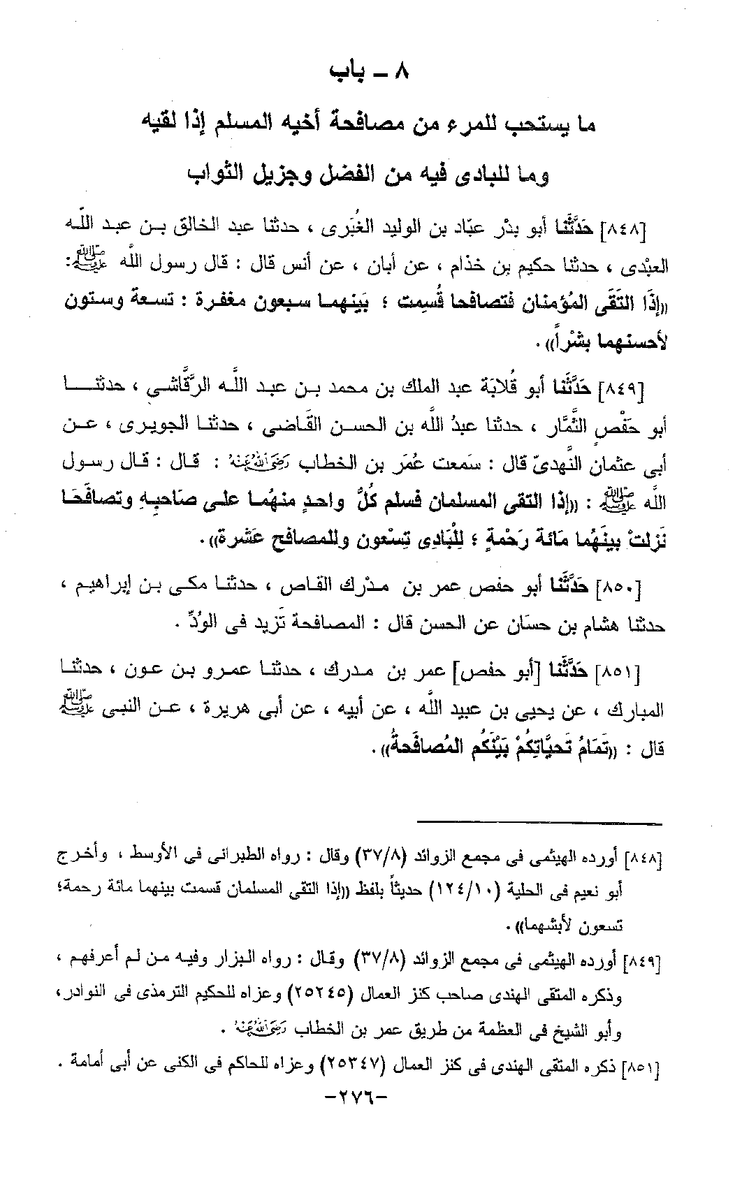 849 - حَدَّثَنَا أَبُو قِلَابَةَ عَبْدُ الْمَلِكِ بْنُ مُحَمَّدِ بْنِ عَبْدِ اللَّهِ الرَّقَاشِيُّ، حَدَّثَنَا أَبُو حَفْصٍ الثَّمَّارُ، حَدَّثَنَا عُبَيْدُ اللَّه بْنُ الْحَسَنِ الْقَاضِي ِ، حَدَّثَنَا الْجُوَيْرِيُّ، عَنْ أَبِي عُثْمَانَ النَّهْدِيِّ، قَالَ: سَمِعْتُ عُمَرَ بْنَ الْخَطَّابِ رَضِيَ اللَّهُ عَنْهُ قَالَ: قَالَ رَسُولُ اللَّهِ صَلَّى اللَّهُ عَلَيْهِ وَسَلَّمَ: «§إِذَا الْتَقَى الْمُسْلِمَانِ، فَسَلَّمَ كُلُّ وَاحِدٍ مِنْهُمَا عَلَى صَاحِبِهِ، وَتَصَافَحَا نَزَلَتْ بَيْنَهُمَا مِائَةُ رَحْمَةٍ، لِلْبَادِي تِسْعُونَ، وَلِلْمُصَافِحِ عَشَرَةٌ»