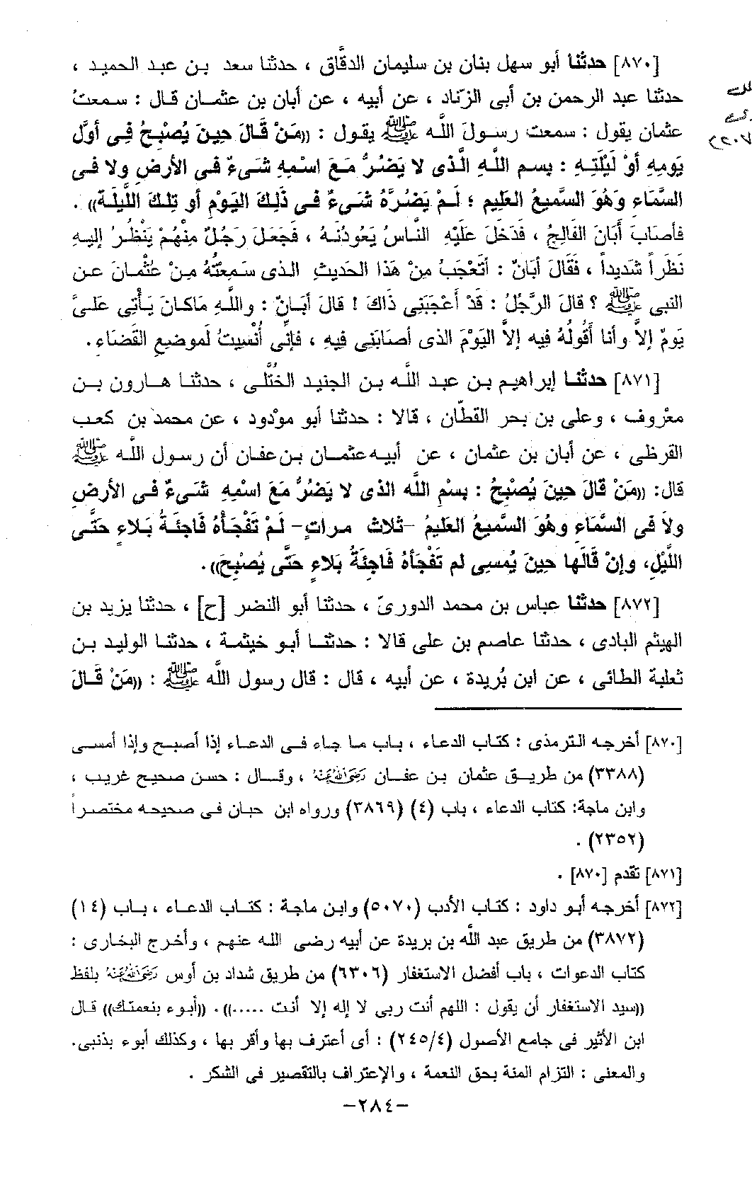 870 - حَدَّثَنَا أَبُو سَهْلٍ بُنَانُ بْنُ سُلَيْمَانَ الدَّقَّاقُ، حَدَّثَنَا سَعْدُ بْنُ عَبْدِ الْحَمِيدِ، حَدَّثَنَا عَبْدُ الرَّحْمَنِ بْنُ أَبِي الزِّنَّادِ، عَنْ أَبِيهِ، عَنْ أَبَانَ بْنِ عُثْمَانَ، قَالَ: سَمِعْتُ عُثْمَانَ، يَقُولُ: سَمِعْتُ رَسُولَ اللَّهِ صَلَّى اللَّهُ عَلَيْهِ وَسَلَّمَ يَقُولُ: " §مَنْ قَالَ حِينَ يُصْبِحُ فِي أَوَّلِ يَوْمِهِ أَوْ لَيْلَتِهِ: بِسْمِ اللَّهِ الَّذِي لَا يَضُرُّ مَعَ اسْمِهِ شَيْءٌ فِي الْأَرْضِ وَلَا فِي السَّمَاءِ، وَهُوَ السَّمِيعُ الْعَلِيمُ، لَمْ يَضُرَّهُ شَيْءٌ فِي ذَلِكَ الْيَوْمِ أَوْ تِلْكَ اللَّيْلَةِ " فَأَصَابَ أَبَانَ الْفَالِجُ، فَدَخَلَ عَلَيْهِ النَّاسُ يَعُودُونَهُ، فَجَعَلَ رَجُلٌ مِنْهُمْ يَنْظُرُ إِلَيْهِ نَظَرًا شَدِيدًا، فَقَالَ أَبَانُ: أَتَعْجَبُ مِنْ هَذَا الْحَدِيثِ الَّذِي سَمِعْتُهُ مِنْ عُثْمَانَ، عَنِ النَّبِيِّ صَلَّى اللَّهُ عَلَيْهِ وَسَلَّمَ؟ قَالَ الرَّجُلُ: قَدْ أَعْجَبَنِي ذَاكَ قَالَ أَبَانُ: وَاللَّهِ مَا كَانَ يَأْتِي عَلَيَّ يَوْمٌ إِلَّا وَأَنَا أَقُولُهُ فِيهِ، إِلَّا الْيَوْمَ الَّذِي أَصَابَنِي فِيهِ، فَإِنِّي أُنْسِيتُ لِمَوْضِعِ الْقَضَاءِ