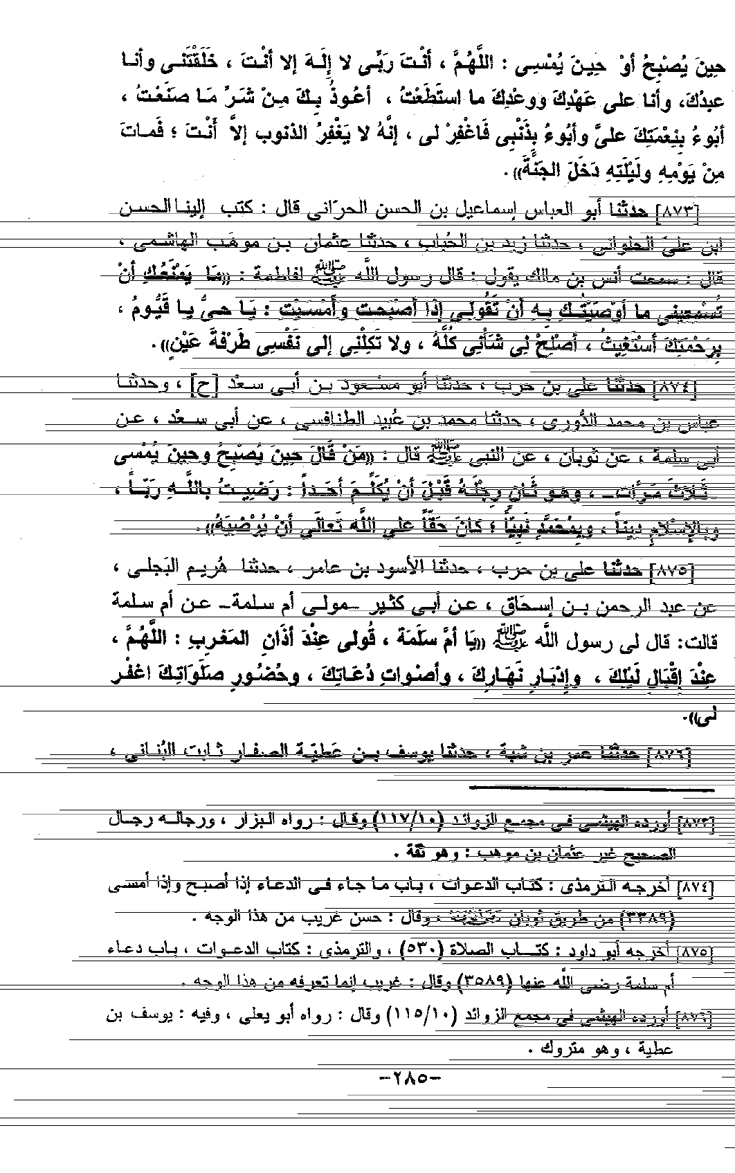 873 - حَدَّثَتْنَا أَبُو الْعَبَّاسِ إِسْمَاعِيلُ بْنُ الْحَسَنِ الْحَرَّانِيُّ قَالَ: كَتَبَ إِلَيْنَا الْحَسَنُ بْنُ عَلِيٍّ الْحُلْوَانِيُّ، حَدَّثَنَا زَيْدُ بْنُ الْحُبَابِ، حَدَّثَنَا عُثْمَانُ بْنُ مَوْهَبٍ الْهَاشِمِيُّ، قَالَ: سَمِعْتُ أَنَسَ بْنَ مَالِكٍ، يَقُولُ: قَالَ رَسُولُ اللَّهِ صَلَّى اللَّهُ عَلَيْهِ وَسَلَّمَ لِفَاطِمَةَ: " §مَا يَمْنَعُكِ أَنْ تُسْمِعِينِي مَا أَوْصَيْتُكِ بِهِ أَنْ تَقُولِي إِذَا أَصْبَحْتِ وَأَمْسَيْتِ: يَا حَيُّ يَا قَيُّومُ، بِرَحْمَتِكَ أَسْتَغِيثُ، أَصْلِحْ لِي شَأْنِي كُلَّهُ، وَلَا تَكِلْنِي إِلَى نَفْسِي طَرْفَةَ عَيْنٍ "