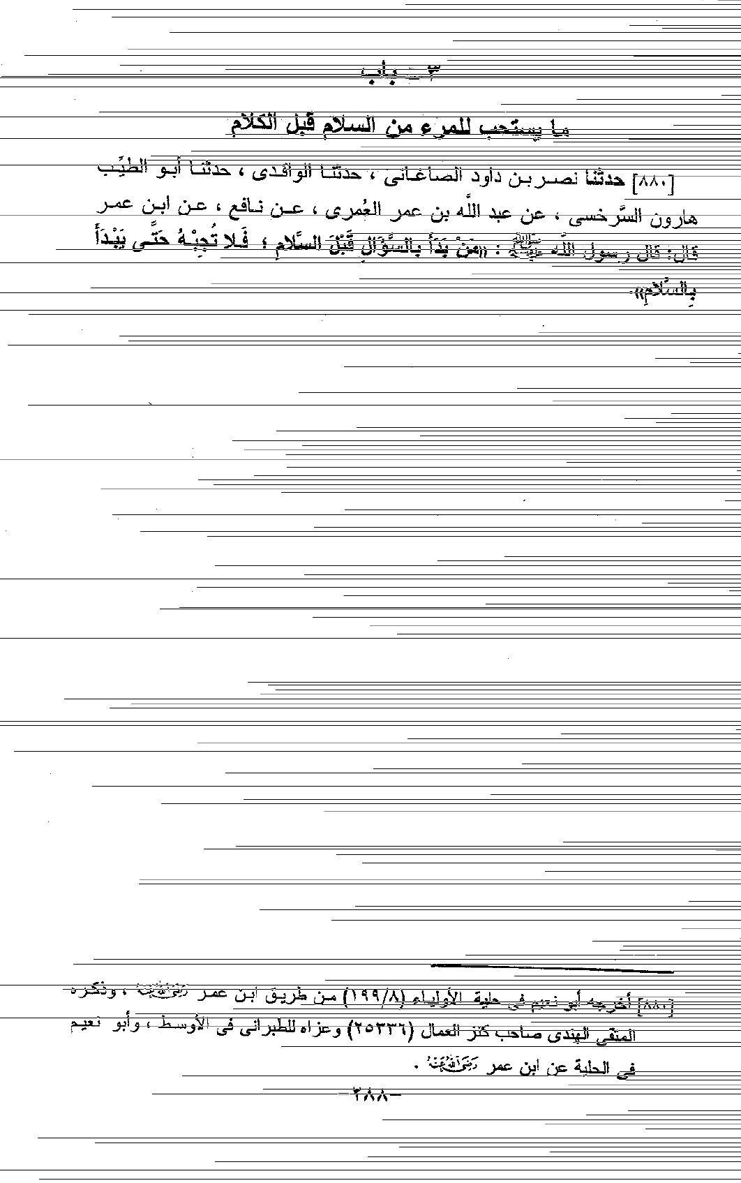 880 - حَدَّثَنَا نَصْرُ بْنُ دَاوُدَ الصَّاغَانِيُّ، حَدَّثَنَا الْوَاقِدِيُّ، حَدَّثَنَا أَبُو الطَّيِّبِ هَارُونُ السَّرَخْسِيُّ، عَنْ عَبْدِ اللَّهِ بْنِ عُمَرَ الْعُمَرِيِّ، عَنْ نَافِعٍ، عَنِ ابْنِ عُمَرَ، قَالَ: قَالَ رَسُولُ اللَّهِ صَلَّى اللَّهُ عَلَيْهِ وَسَلَّمَ: «§مَنْ بَدَأَ بِالسُّؤَالِ قَبْلَ السَّلَامِ، فَلَا تُجِبْهُ حَتَّى يَبْدَأَ بِالسَّلَامِ»