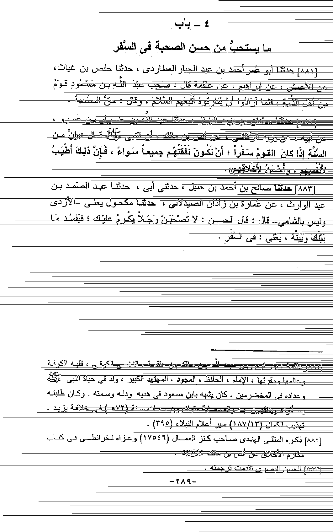 883 - حَدَّثَنَا صَالِحُ بْنُ أَحْمَدَ بْنِ حَنْبَلٍ، حَدَّثَنِي أَبِي، حَدَّثَنَا عَبْدُ الصَّمَدِ بْنُ عَبْدِ الْوَارِثِ، عَنْ عُمَارَةَ بْنِ زَاذَانَ الصَّيْدَلَانِيِّ، حَدَّثَنَا مَكْحُولٌ يَعْنِي الْأَزْدِيَّ، وَلَيْسَ بِالشَّامِيِّ قَالَ: قَالَ الْحَسَنُ: «§لَا تَصْحَبَّنَّ رَجُلًا يَكْرُمُ عَلَيْكَ، فَيُفْسِدُ مَا بَيْنَكَ وَبَيْنَهُ يَعْنِي فِي السَّفَرِ»