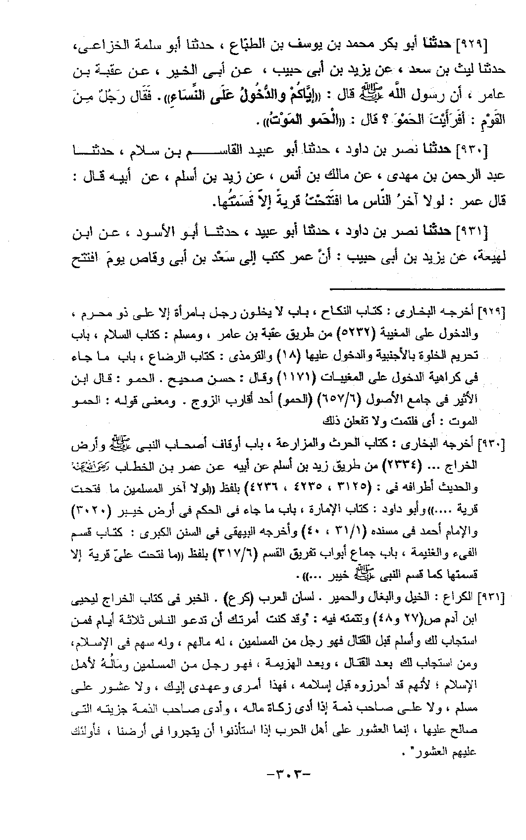 930 - حَدَّثَنَا نَصْرُ بْنُ دَاوُدَ، حَدَّثَنَا أَبُو عُبَيْدٍ الْقَاسِمُ بْنُ سَلَّامٍ، حَدَّثَنَا عَبْدُ الرَّحْمَنِ بْنُ مَهْدِيٍّ، عَنْ مَالِكِ بْنِ أَنَسٍ، عَنْ زَيْدِ بْنِ أَسْلَمَ، عَنْ أَبِيهِ، قَالَ: قَالَ عُمَرُ: «§لَوْلَا آخِرُ النَّاسِ مَا افْتَتَحْتُ قَرْيَةً إِلَّا قَسَمْتُهَا»