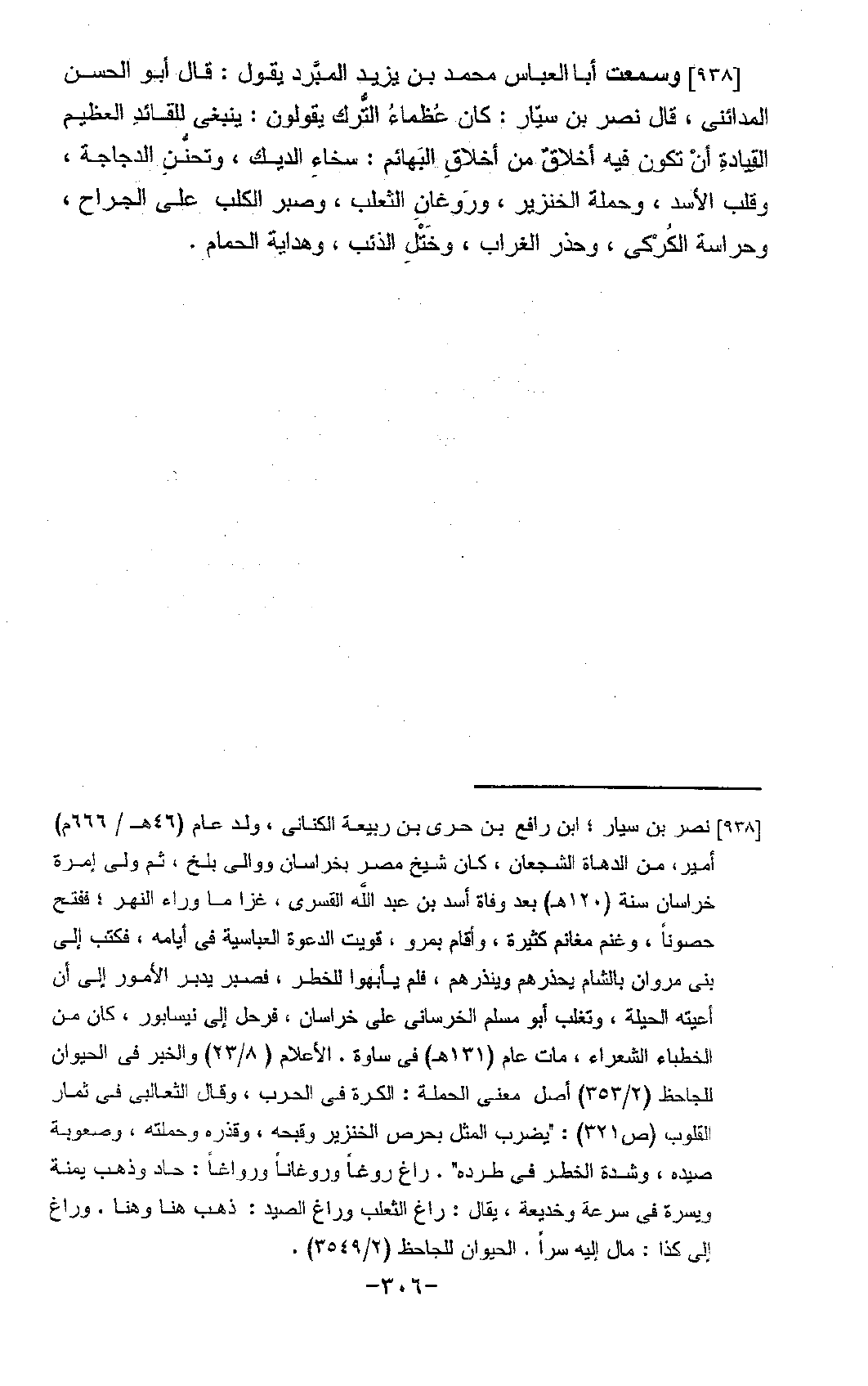 938 - وَسَمِعْتُ أَبَا الْعَبَّاسِ مُحَمَّدَ بْنَ يَزِيدَ الْمُبَرِّدَ يَقُولُ: قَالَ أَبُو الْحَسَنِ الْمَدَائِنِيُّ: قَالَ نَصْرُ بْنُ سَيَّارٍ: كَانَ عُظَمَاءُ التُّرْكِ يَقُولُونَ: " §يَنْبَغِي لِلْقَائِدِ الْعَظِيمِ الْقِيَادَةِ أَنْ تَكُونَ فِيهِ أَخْلَاقٌ مِنْ أَخْلَاقِ الْبَهَائِمِ: سَخَاءُ الدِّيكِ، وَتَحَنُّنُ الدَّجَاجَةِ، وَقَلْبُ الْأَسَدِ، وَحِمْلَةُ الْخِنْزِيرِ، وَرَوَغَانُ الثَّعْلَبِ، وَصَبْرُ الْكَلْبِ عَلَى الْجِرَاحِ، وَحِرَاسَةُ الْكُرْكِيِّ، وَحَذَرُ الْغُرَابِ، وَخَتْلُ الذِّئْبِ، وَهِدَايَةُ الْحَمَامِ "