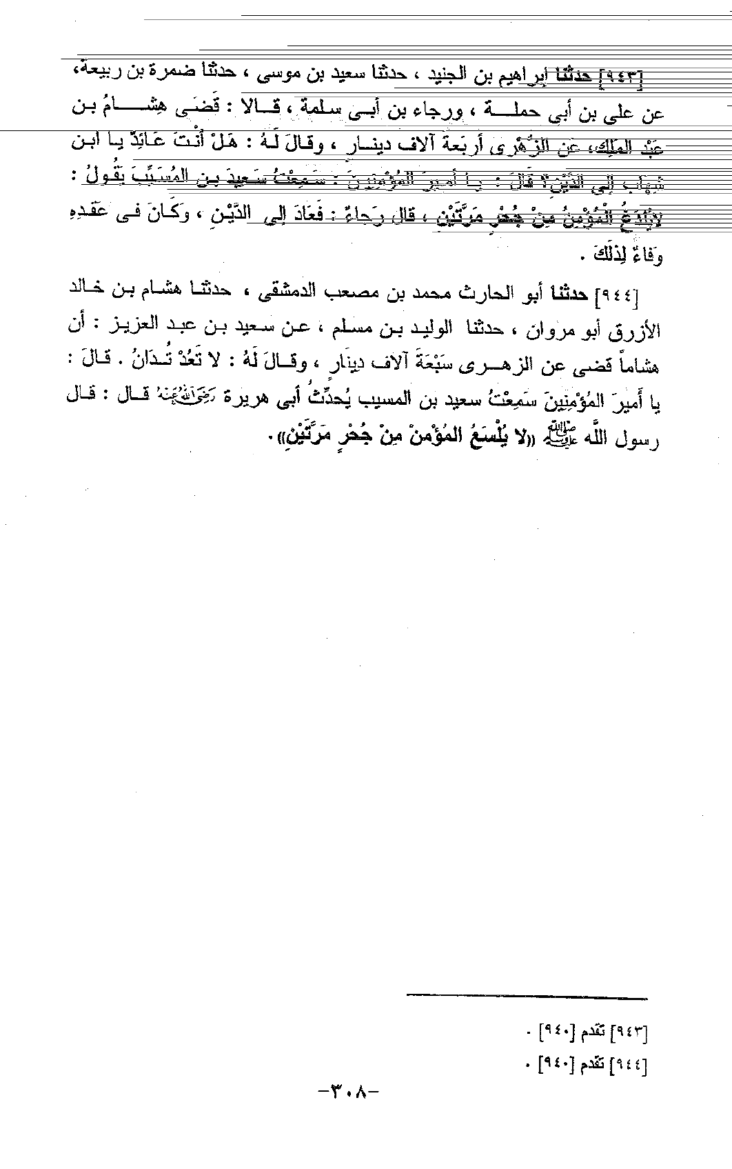 944 - حَدَّثَنَا أَبُو الْحَارِثِ مُحَمَّدُ بْنُ مُصْعَبٍ الدِّمَشْقِيُّ، حَدَّثَنَا هِشَامُ بْنُ خَالِدٍ الْأَزْرَقُ أَبُو مَرْوَانَ، حَدَّثَنَا الْوَلِيدُ بْنُ مُسْلِمٍ، عَنْ سَعِيدِ بْنِ عَبْدِ الْعَزِيزِ، أَنَّ هِشَامًا قَضَى عَنِ الزُّهْرِيِّ سَبْعَةَ آلَافِ دِينَارٍ، وَقَالَ لَهُ: لَا تَعُدْ تُدَانُ قَالَ: يَا أَمِيرُ الْمُؤْمِنِينَ، سَمِعْتُ سَعِيدَ بْنَ الْمُسَيِّبِ يُحَدِّثُ عَنْ أَبِي هُرَيْرَةَ رَضِيَ اللَّهُ عَنْهُ قَالَ: قَالَ رَسُولُ اللَّهِ صَلَّى اللَّهُ عَلَيْهِ وَسَلَّمَ: «§لَا يُلْسَعُ الْمُؤْمِنُ مِنْ جُحْرٍ مَرَّتَيْنِ»