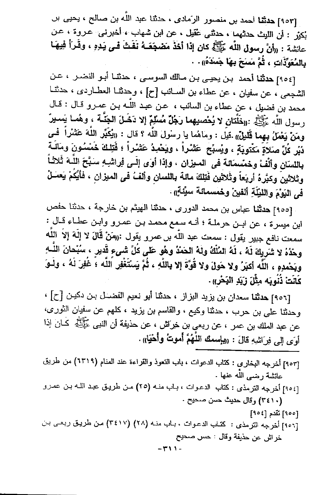956 - حَدَّثَنَا سَعْدَانُ بْنُ يَزِيدَ الْبَزَّارُ، حَدَّثَنَا أَبُو نُعَيْمٍ الْفَضْلُ بْنُ دُكَيْنٍ. ح. وَحَدَّثَنَا عَلِيُّ بْنُ حَرْبٍ، حَدَّثَنَا وَكِيعٌ، وَالْقَاسِمُ بْنُ يَزِيدَ، كُلُّهُمْ عَنْ سُفْيَانَ الثَّوْرِيِّ، عَنْ عَبْدِ الْمَلِكِ بْنِ عُمَيْرٍ، عَنْ رِبْعِيِّ بْنِ حِرَاشٍ، عَنْ حُذَيْفَةَ، " أَنَّ النَّبِيَّ صَلَّى اللَّهُ عَلَيْهِ وَسَلَّمَ كَانَ §إِذَا أَوَى إِلَى فِرَاشِهِ قَالَ: بِاسْمِكَ اللَّهُمَّ أَمُوتُ وَأَحْيَا "