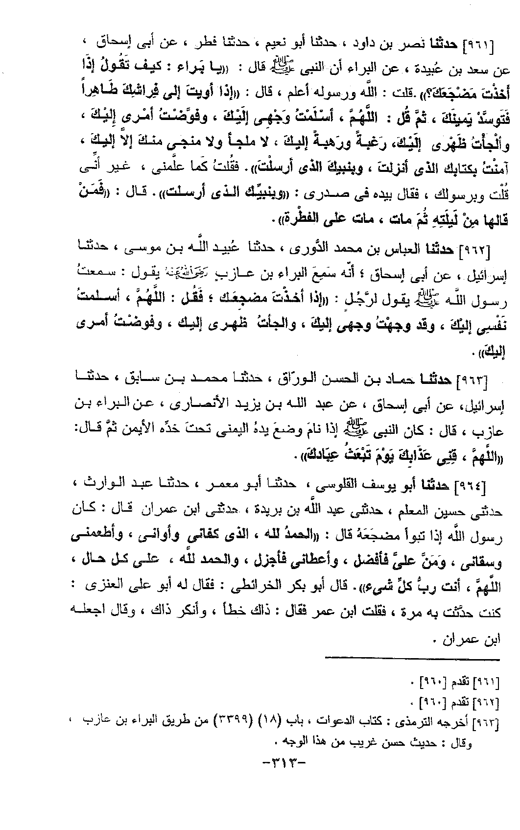 961 - حَدَّثَنَا نَصْرُ بْنُ دَاوُدَ، حَدَّثَنَا أَبُو نُعَيْمٍ، حَدَّثَنَا فِطْرٌ، عَنْ أَبِي إِسْحَاقَ، عَنْ سَعْدِ بْنِ عُبَيْدَةَ، عَنِ الْبَرَاءِ، أَنَّ النَّبِيَّ صَلَّى اللَّهُ عَلَيْهِ وَسَلَّمَ قَالَ: يَا بَرَاءُ، " §كَيْفَ تَقُولُ إِذَا أَخَذْتَ مَضْجَعَكَ؟ قُلْتُ: اللَّهُ وَرَسُولُهُ أَعْلَمُ قَالَ: إِذَا أَوَيْتَ إِلَى فِرَاشِكَ طَاهِرًا، فَتَوَسَّدْ يَمِينَكَ، ثُمَّ قُلْ: اللَّهُمَّ أَسْلَمْتُ وَجْهِي إِلَيْكَ، وَفَوَّضْتُ أَمْرِي إِلَيْكَ، وَأَلْجَأْتُ ظَهْرِي إِلَيْكَ، رَغْبَةً وَرَهْبَةً إِلَيْكَ، لَا مَلْجَأَ وَلَا مَنْجَى مِنْكَ إِلَّا إِلَيْكَ، آمَنْتُ بِكِتَابِكَ الَّذِي أَنْزَلْتَ، وَبِنَبِيِّكَ الَّذِي أَرْسَلْتَ فَقُلْتُ كَمَا عَلَّمَنِي، غَيْرَ أَنِّي قُلْتُ: وَبِرَسُولِكَ، فَقَالَ بِيَدِهِ فِي صَدْرِي: وَبِنَبِيِّكَ الَّذِي أَرْسَلْتَ قَالَ: فَمَنْ قَالَهَا مِنْ لَيْلَتِهِ، ثُمَّ مَاتَ، مَاتَ عَلَى الْفِطْرَةِ "