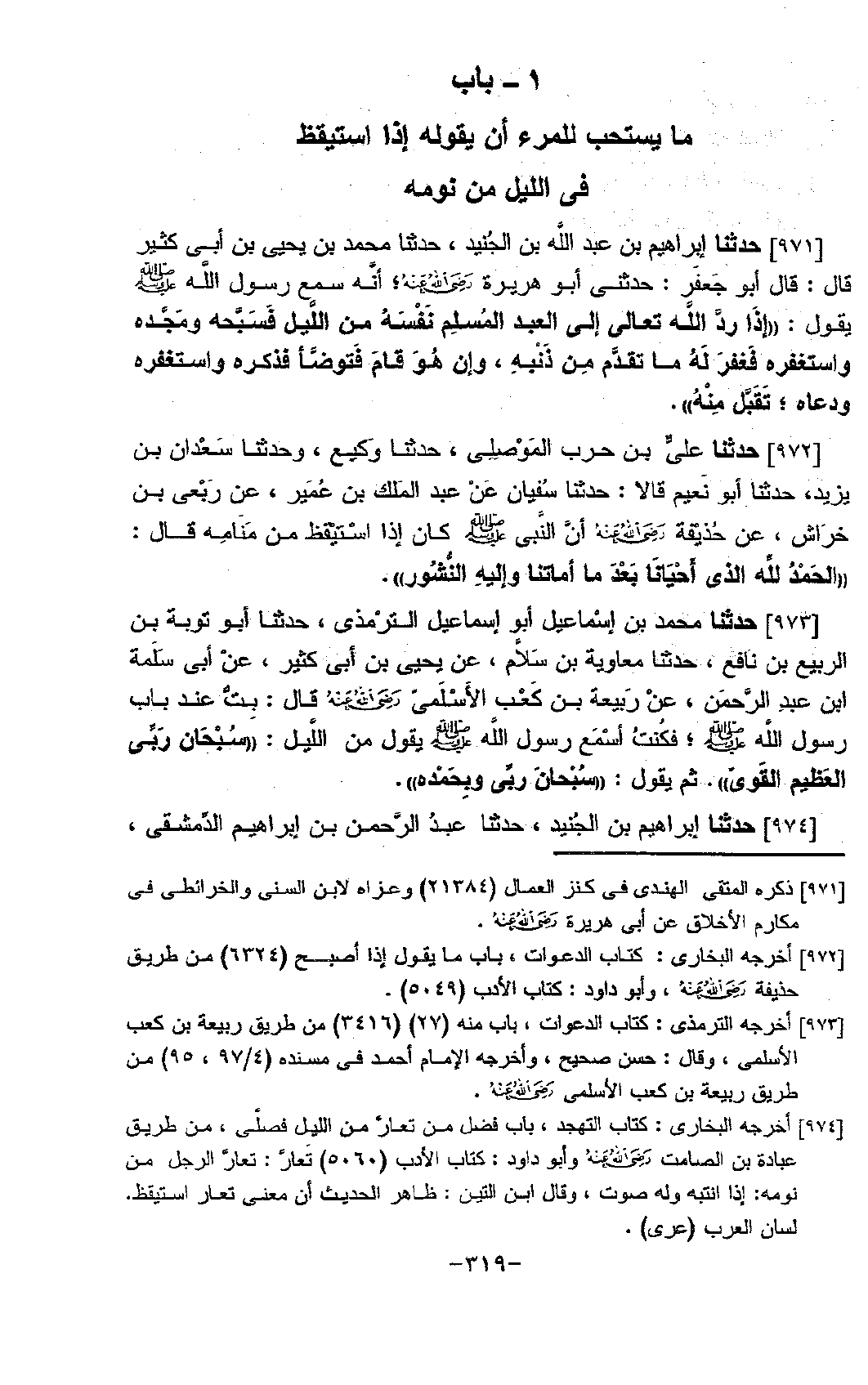 972 - حَدَّثَنَا عَلِيُّ بْنُ حَرْبٍ الْمَوْصِلِيُّ، حَدَّثَنَا وَكِيعٌ، وَحَدَّثَنَا سَعْدَانُ بْنُ يَزِيدَ، حَدَّثَنَا أَبُو نُعَيْمٍ، قَالَا: حَدَّثَنَا سُفْيَانُ، عَنْ عَبْدِ الْمَلِكِ بْنِ عُمَيْرٍ، عَنْ رِبْعِيِّ بْنِ حِرَاشٍ، عَنْ حُذَيْفَةَ، رَضِيَ اللَّهُ عَنْهُ " §أَنَّ النَّبِيَّ صَلَّى اللَّهُ عَلَيْهِ وَسَلَّمَ كَانَ إِذَا اسْتَيْقَظَ مِنْ مَنَامِهِ قَالَ: الْحَمْدُ لِلَّهِ الَّذِي أَحْيَانَا بَعْدَ مَا أَمَاتَنَا، وَإِلَيْهِ النُّشُورُ "