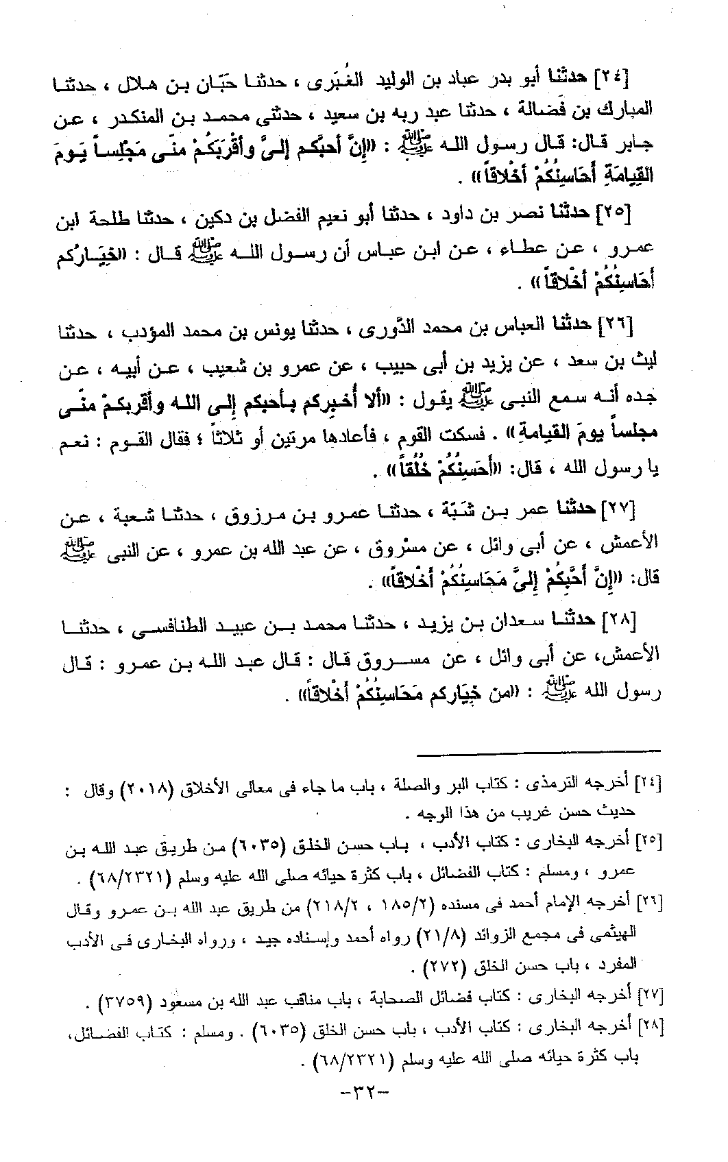 24 - حَدَّثَنَا أَبُو بَدْرٍ عَبَّادُ بْنُ الْوَلِيدِ الْغُبَرِيُّ، حَدَّثَنَا حَبَّانُ بْنُ هِلَالٍ، حَدَّثَنَا الْمُبَارَكُ بْنُ فَضَالَةَ، حَدَّثَنَا عَبْدُ رَبِّهِ بْنُ سَعِيدٍ، حَدَّثَنِي مُحَمَّدُ بْنُ الْمُنْكَدِرِ، عَنْ جَابِرٍ، قَالَ: قَالَ رَسُولُ اللَّهِ صَلَّى اللَّهُ عَلَيْهِ وَسَلَّمَ: «إِنَّ §أَحَبَّكُمْ إِلَيَّ، وَأَقْرَبَكُمْ مِنِّي مَجْلِسًا يَوْمَ الْقِيَامَةِ أَحَاسِنُكُمْ أَخْلَاقًا»