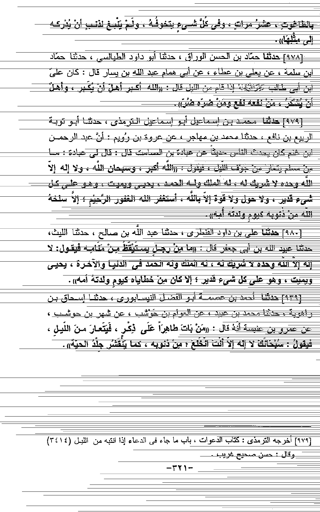 979 - حَدَّثَنَا مُحَمَّدُ بْنُ إِسْمَاعِيلَ أَبُو إِسْمَاعِيلَ التِّرْمِذِيُّ، حَدَّثَنَا أَبُو تَوْبَةَ الرَّبِيعُ بْنُ نَافِعٍ، حَدَّثَنَا مُحَمَّدُ بْنُ مُهَاجِرٍ، عَنْ عُرْوَةَ بْنِ رُوَيْمٍ أَنَّ عَبْدَ الرَّحْمَنِ بْنَ غَنْمٍ كَانَ يُحَدِّثُ النَّاسَ حَدِيثًا عَنْ عُبَادَةَ بْنِ الصَّامِتِ، قَالَ: قَالَ لِي عُبَادَةُ: " §مَا مِنْ مُسْلِمٍ يَتَعَارُّ مِنْ جَوْفِ اللَّيْلِ، فَيَقُولُ: اللَّهُ أَكْبَرُ، وَسُبْحَانَ اللَّهِ، وَلَا إِلَهَ إِلَّا اللَّهُ، وَحْدَهُ لَا شَرِيكَ لَهُ، لَهُ الْمُلْكُ، وَلَهُ الْحَمْدُ، يُحْيِي وَيُمِيتُ، وَهُوَ عَلَى كُلِّ شَيْءٍ قَدِيرٌ، وَلَا حَوْلَ وَلَا قُوَّةَ إِلَّا بِاللَّهِ، أَسْتَغْفِرُ اللَّهَ الْغَفُورَ الرَّحِيمَ، إِلَّا سَلَخَهُ اللَّهُ مِنْ ذُنُوبِهِ كَيَوْمِ وَلَدَتْهُ أُمُّهُ "