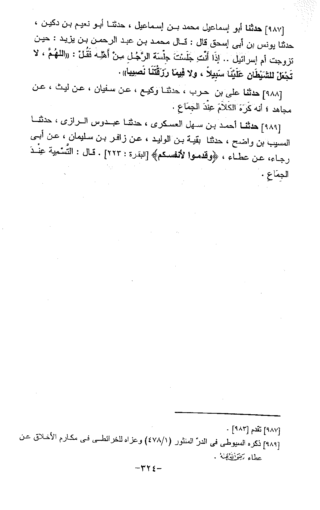 989 - حَدَّثَنَا أَحْمَدُ بْنُ سَهْلٍ الْعَسْكَرِيُّ، حَدَّثَنَا عَبْدُوسٌ الرَّازِيُّ، حَدَّثَنَا الْمُسَيَّبُ بْنُ وَاضِحٍ، حَدَّثَنَا بَقِيَّةُ بْنُ الْوَلِيدِ، عَنْ زَافِرِ بْنِ سُلَيْمَانَ، عَنْ أَبِي رَجَاءٍ، عَنْ عَطَاءٍ: " {§وَقَدِّمُوا لِأَنْفُسِكُمْ} [البقرة: 223] ، قَالَ: التَّسْمِيَةَ عِنْدَ الْجِمَاعِ "