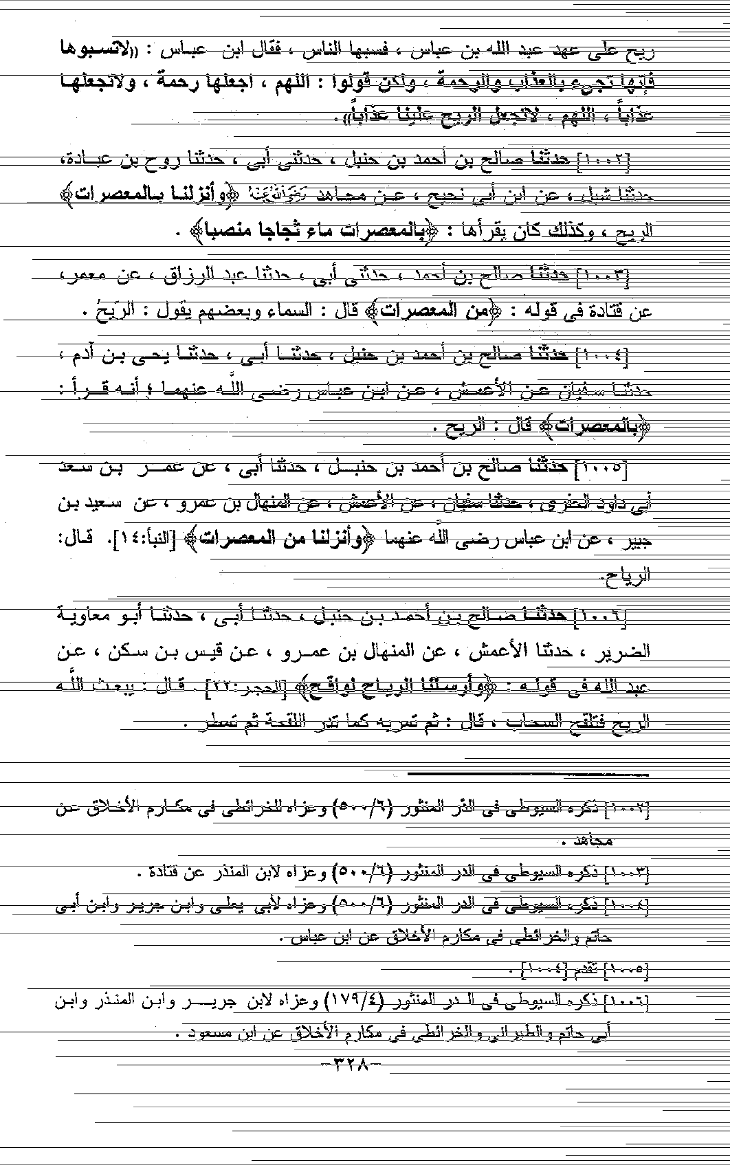 1005 - حَدَّثَنَا صَالِحُ بْنُ أَحْمَدَ بْنِ حَنْبَلٍ، حَدَّثَنَا أَبِي، عَنْ عُمَرَ بْنِ سَعْدٍ أَبِي دَاوُدَ الْحَفَرِيِّ، حَدَّثَنَا سُفْيَانُ، عَنِ الْأَعْمَشِ، عَنِ الْمِنْهَالِ بْنِ عَمْرٍو، عَنْ سَعِيدِ بْنِ جُبَيْرٍ، عَنِ ابْنِ عَبَّاسٍ، رَضِيَ اللَّهُ عَنْهُمَا: " {§وَأَنْزَلْنَا مِنَ الْمُعْصِرَاتِ} [النبأ: 14] قَالَ: الرِّيَاحُ "