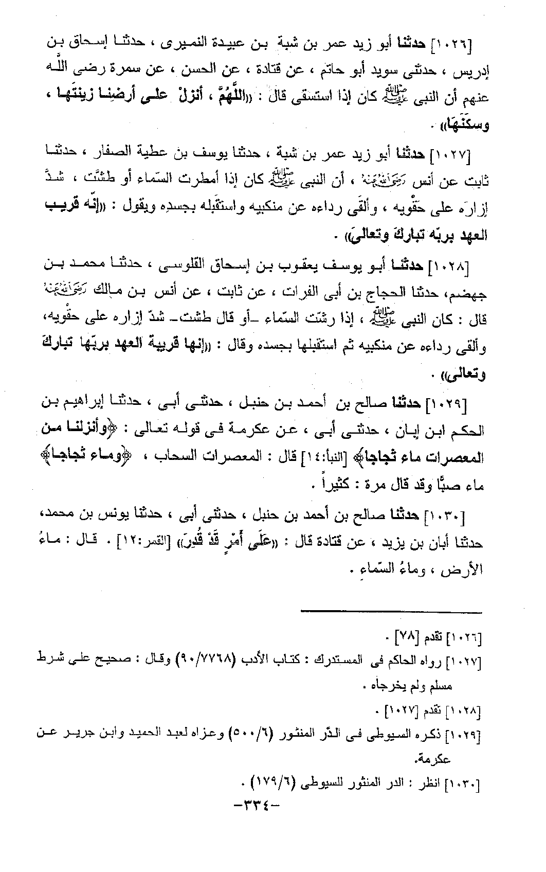 1027 - حَدَّثَنَا أَبُو زَيْدٍ عُمَرُ بْنُ شَبَّةَ، حَدَّثَنَا يُوسُفُ بْنُ عَطِيَّةَ الصَّفَّارُ، حَدَّثَنَا ثَابِتٌ، عَنْ أَنَسٍ، رَضِيَ اللَّهُ عَنْهُ أَنَّ النَّبِيَّ صَلَّى اللَّهُ عَلَيْهِ وَسَلَّمَ " كَانَ §إِذَا أَمْطَرَتِ السَّمَاءُ أَوْ طَشَّتْ، شَدَّ إِزَارَهُ عَلَى حِقْوَيْهِ، وَأَلْقَى رِدَاءَهُ عَنْ مَنْكِبَيْهِ، وَاسْتَقْبَلَهُ بِجَسَدِهِ، وَيَقُولُ: إِنَّهُ قَرِيبُ الْعَهْدِ بِرَبِّهِ تَبَارَكَ وَتَعَالَى "
