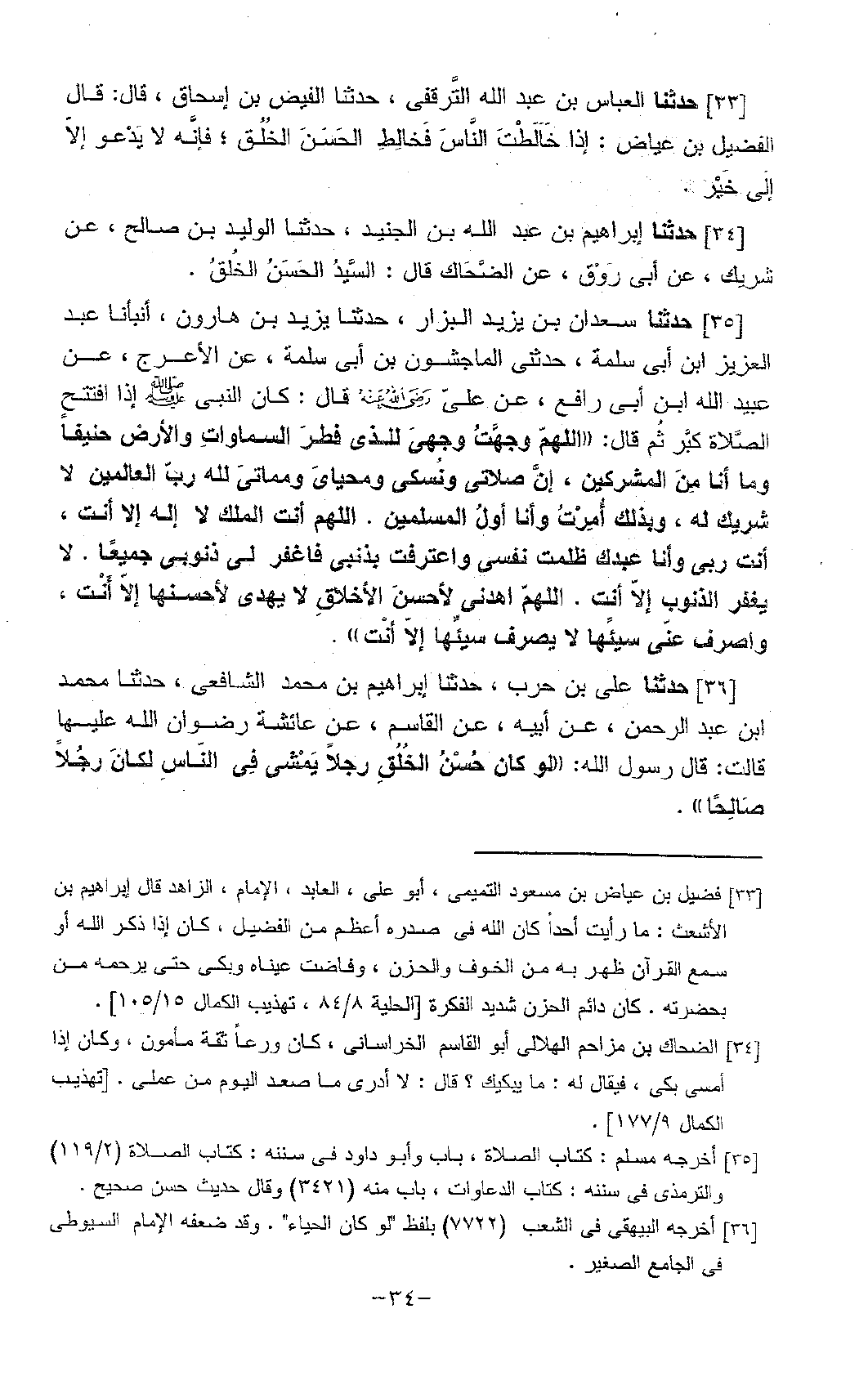 34 - حَدَّثَنَا إِبْرَاهِيمُ بْنُ عَبْدِ اللَّهِ بْنِ الْجُنَيْدِ، حَدَّثَنَا الْوَلِيدُ بْنُ صَالِحٍ، عَنْ شَرِيكٍ، عَنْ أَبِي رَوْقٍ، عَنِ الضَّحَّاكِ، قَالَ: «§السَّيِّدُ الْحَسَنُ الْخُلُقُ»