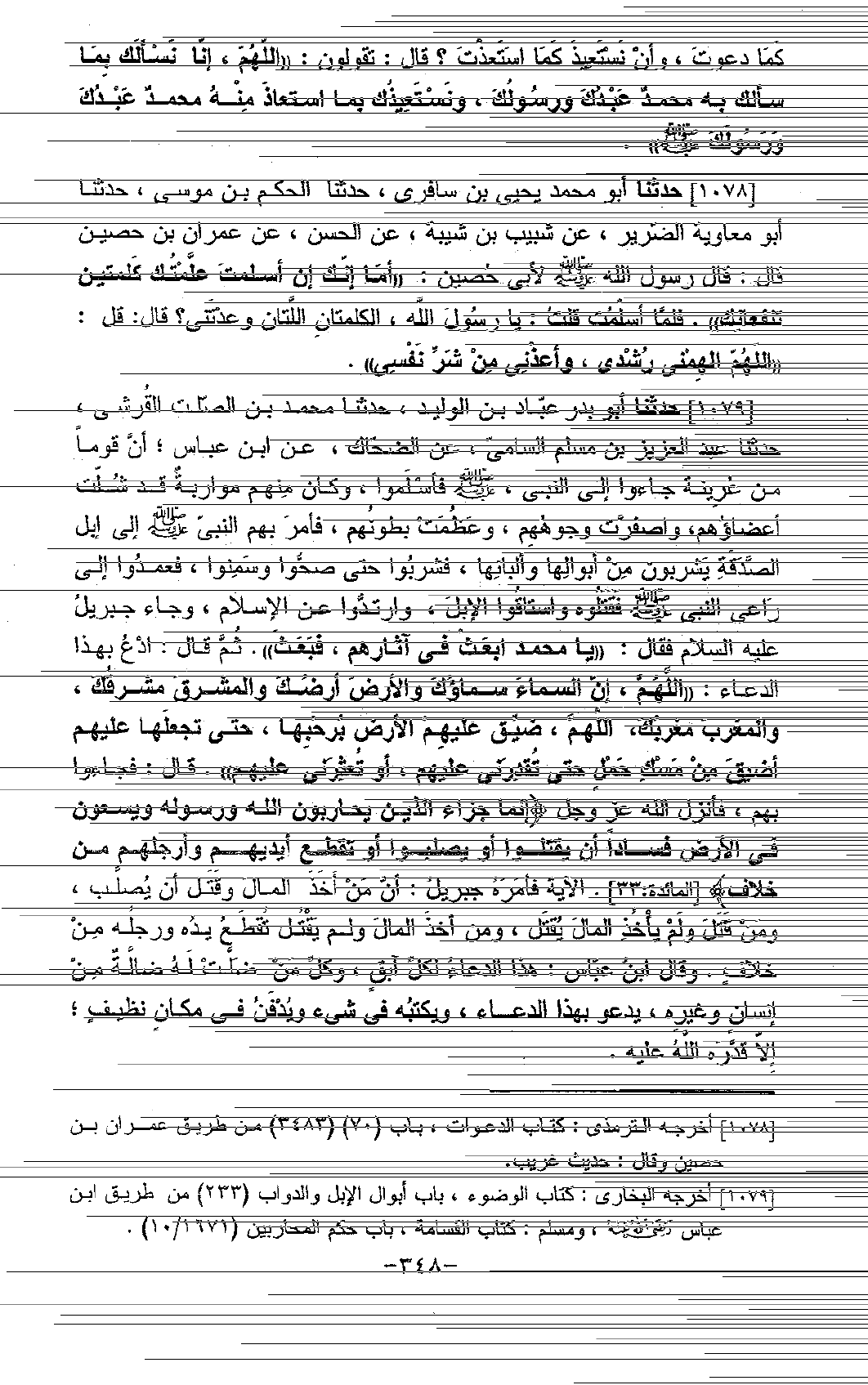 1079 - حَدَّثَنَا أَبُو بَدْرٍ عَبَّادُ بْنُ الْوَلِيدِ، حَدَّثَنَا مُحَمَّدُ بْنُ الصَّلْتِ الْقُرَشِيُّ، حَدَّثَنَا عَبْدُ الْعَزِيزِ بْنُ مُسْلِمٍ الْقَسْلَمِيُّ، عَنِ الضَّحَّاكِ، عَنِ ابْنِ عَبَّاسٍ، " أَنَّ قَوْمًا مِنْ عُرَيْنَةَ جَاءُوا إِلَى النَّبِيِّ صَلَّى اللَّهُ عَلَيْهِ وَسَلَّمَ، فَأَسْلَمُوا، وَكَانَ مِنْهُمْ مُوَارِبَةٌ، قَدْ شُلَّتْ أَعْضَاؤُهُمْ، وَاصْفَرَّتْ وُجُوهُهُمْ، وَعَظُمَتْ بُطُونُهُمْ، فَأَمَرَ بِهِمُ النَّبِيُّ صَلَّى اللَّهُ عَلَيْهِ وَسَلَّمَ إِلَى إِبِلِ الصَّدَقَةِ، يَشْرَبُونَ مِنْ أَبْوَالِهَا وَأَلْبَانِهَا، فَشَرِبُوا حَتَّى صَحُّوا وَسَمِنُوا، فَعَمَدُوا إِلَى رَاعِي النَّبِيِّ صَلَّى اللَّهُ عَلَيْهِ وَسَلَّمَ، فَقَتَلُوهُ، وَاسْتَاقُوا الْإِبِلَ، وَارْتَدُّوا عَنِ الْإِسْلَامِ، وَجَاءَ جِبْرِيلُ عَلَيْهِ السَّلَامُ، فَقَالَ: يَا مُحَمَّدُ، ابْعَثْ فِي آثَارِهِمْ فَبَعَثَ، ثُمَّ قَالَ: ادْعُ بِهَذَا الدُّعَاءِ: §اللَّهُمَّ إِنَّ السَّمَاءَ سَمَاؤُكَ، وَالْأَرْضَ أَرْضُكَ، وَالْمَشْرِقَ مَشْرِقُكَ، وَالْمَغْرِبَ مَغْرِبُكَ، اللَّهُمَّ ضَيِّقِ الْأَرْضَ بِرَحْبِهَا، حَتَّى تَجْعَلَهَا عَلَيْهِمْ أَضْيَقَ مِنْ مَسْكِ حَمَلٍ حَتَّى تُقْدِرَنِي عَلَيْهِمْ، أَوْ تُعْثِرَنِي عَلَيْهِمْ قَالَ: فَجَاءُوا بِهِمْ، فَأَنْزَلَ اللَّهُ عَزَّ وَجَلَّ: {إِنَّمَا جَزَاءُ الَّذِينَ يُحَارِبُونَ اللَّهَ وَرَسُولَهُ وَيَسْعَوْنَ فِي الْأَرْضِ فَسَادًا أَنْ يُقَتَّلُوا أَوْ يُصَلَّبُوا أَوْ تُقَطَّعَ أَيْدِيهِمْ وَأَرْجُلُهُمْ مِنْ خِلَافٍ} [المائدة: 33] الْآيَةَ، فَأَمَرَهُ جِبْرِيلُ أَنَّ مَنْ أَخَذَ الْمَالَ وَقَتَلَ أَنْ يُصْلَبَ، وَمَنْ قَتَلَ وَلَمْ يَأْخُذِ الْمَالَ يُقْتَلْ، وَمَنْ أَخَذَ الْمَالَ وَلَمْ يَقْتُلْ تُقْطَعْ يَدُهُ وَرِجْلُهُ مِنْ خِلَافٍ. وَقَالَ ابْنُ عَبَّاسٍ: هَذَا الدُّعَاءُ لِكُلِّ آبِقٍ، وَكُلِّ مَنْ ضَلَّتْ لَهُ ضَالَّةٌ مِنْ إِنْسَانٍ وَغَيْرِهِ، يَدْعُو بِهَذَا الدُّعَاءِ، وَيَكْتُبُهُ فِي شَيْءٍ، وَيُدْفَنُ فِي مَكَانٍ نَظِيفٍ، إِلَّا قَدَّرَهُ اللَّهُ عَلَيْهِ "