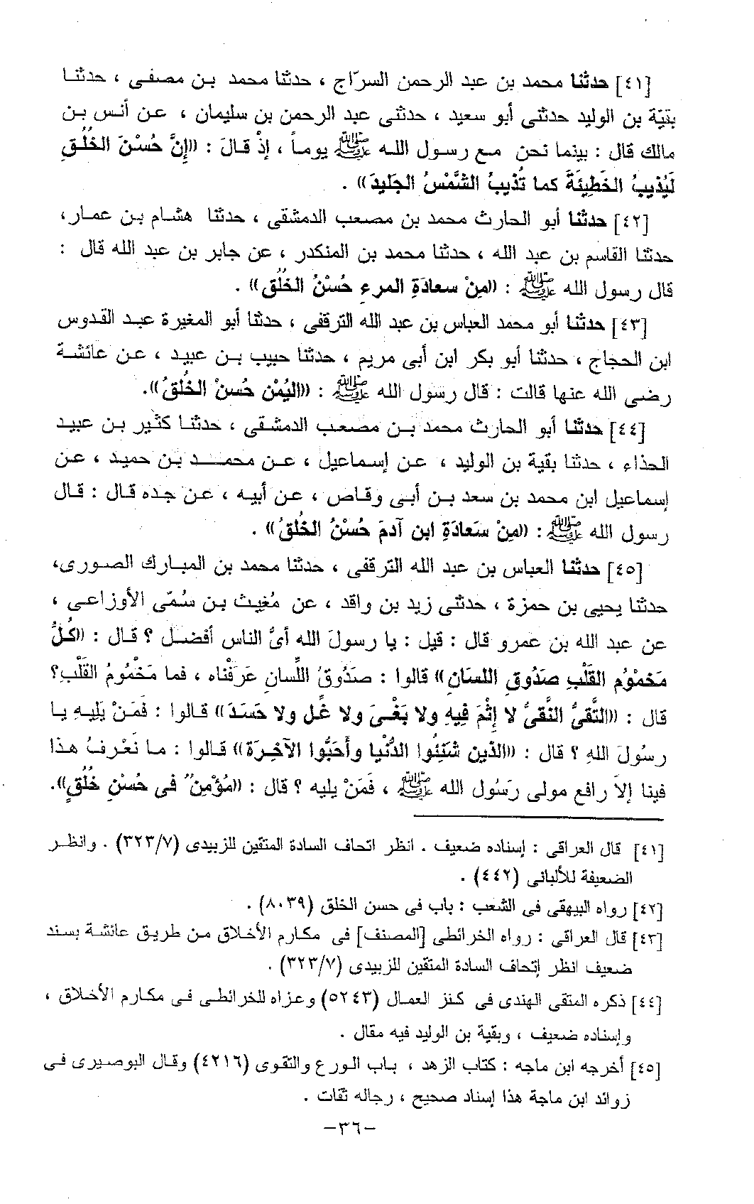41 - حَدَّثَنَا مُحَمَّدُ بْنُ عَبْدِ الرَّحْمَنِ السَّرَّاجُ، حَدَّثَنَا مُحَمَّدُ بْنُ مُصَفَّى، حَدَّثَنَا بَقِيَّةُ بْنُ الْوَلِيدِ، حَدَّثَنِي أَبُو سَعِيدٍ، حَدَّثَنِي عَبْدُ الرَّحْمَنِ بْنُ سُلَيْمَانَ، عَنْ أَنَسِ بْنِ مَالِكٍ، قَالَ: بَيْنَمَا نَحْنُ مَعَ رَسُولِ اللَّهِ صَلَّى اللَّهُ عَلَيْهِ وَسَلَّمَ يَوْمًا إِذْ قَالَ: «إِنَّ §حُسْنَ الْخُلُقِ لَيُذِيبُ الْخَطِيئَةَ كَمَا تُذِيبُ الشَّمْسُ الْجَلِيدَ»