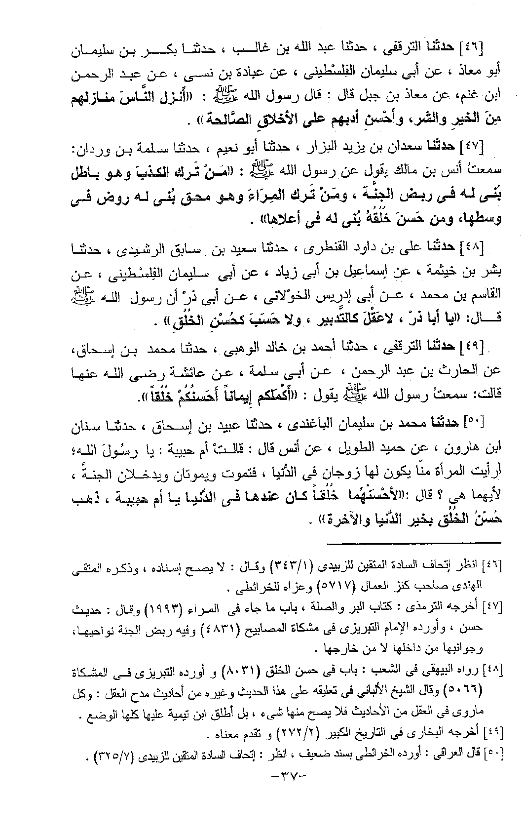 46 - حَدَّثَنَا التَّرْقُفِيُّ، حَدَّثَنَا عَبْدُ اللَّهِ بْنُ غَالِبٍ، حَدَّثَنَا بَكْرُ بْنُ سُلَيْمَانَ أَبُو مُعَاذٍ، عَنْ أَبِي سُلَيْمَانَ الْفِلَسْطِينِيِّ، عَنْ عُبَادَةَ بْنِ نُسَيٍّ، عَنْ عَبْدِ الرَّحْمَنِ بْنِ غَنْمٍ، عَنْ مُعَاذِ بْنِ جَبَلٍ، قَالَ: قَالَ رَسُولُ اللَّهِ صَلَّى اللَّهُ عَلَيْهِ وَسَلَّمَ: «§أَنْزِلِ النَّاسَ مَنَازِلَهُمْ مِنَ الْخَيْرِ وَالشَّرِّ، وَأَحْسِنْ أَدَبَهُمْ عَلَى الْأَخْلَاقِ الصَّالِحَةِ»