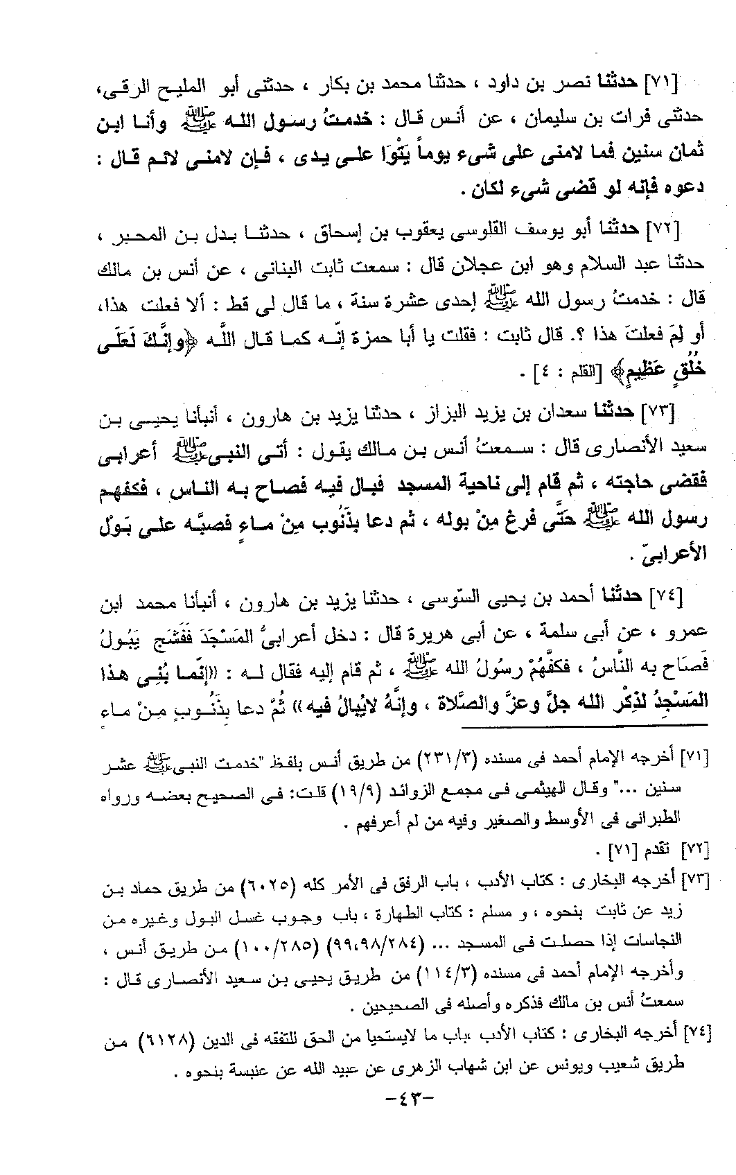 73 - حَدَّثَنَا سَعْدَانُ بْنُ يَزِيدَ الْبَزَّازُ، حَدَّثَنَا يَزِيدُ بْنُ هَارُونَ، أَنْبَأَنَا يَحْيَى بْنُ سَعِيدٍ الْأَنْصَارِيُّ، قَالَ: سَمِعْتُ أَنَسَ بْنَ مَالِكٍ، يَقُولُ: «§أَتَى النَّبِيَّ صَلَّى اللَّهُ عَلَيْهِ وَسَلَّمَ أَعْرَابِيٌّ، فَقَضَى حَاجَتَهُ، ثُمَّ قَامَ إِلَى نَاحِيَةِ الْمَسْجِدِ، فَبَالَ فِيهِ، فَصَاحَ بِهِ النَّاسُ، فَكَفَّهُمْ رَسُولُ اللَّهِ صَلَّى اللَّهُ عَلَيْهِ وَسَلَّمَ حَتَّى فَرَغَ مِنْ بَوْلِهِ، ثُمَّ دَعَا بِذَنُوبٍ مِنْ مَاءٍ، فَصَبَّهُ عَلَى بَوْلِ الْأَعْرَابِيِّ»