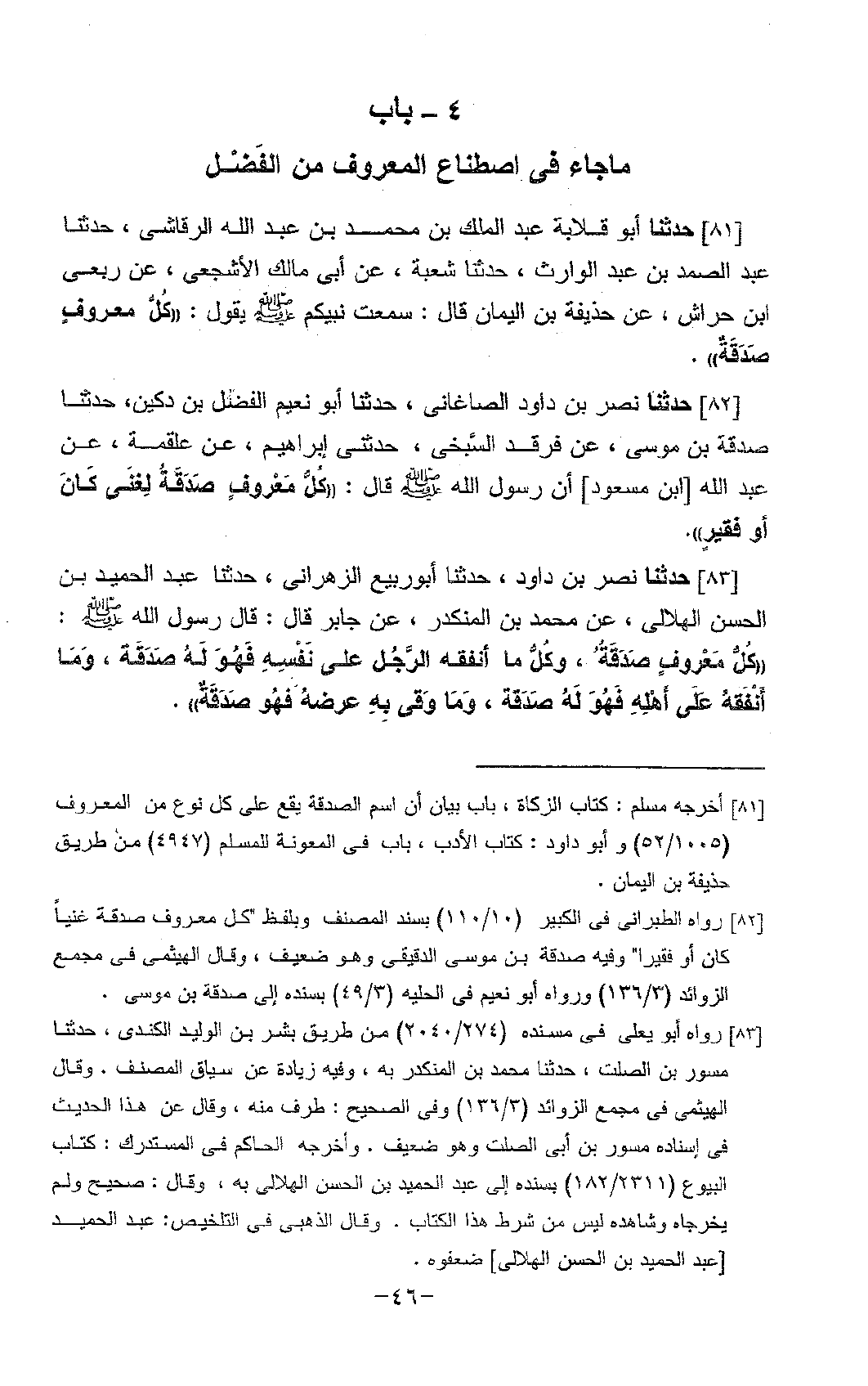 81 - حَدَّثَنَا أَبُو قِلَابَةَ عَبْدُ الْمَلِكِ بْنُ مُحَمَّدِ بْنِ عَبْدِ اللَّهِ الرَّقَاشِيُّ، حَدَّثَنَا عَبْدُ الصَّمَدِ بْنُ عَبْدِ الْوَارِثِ، حَدَّثَنَا شُعْبَةُ، عَنْ أَبِي مَالِكٍ الْأَشْجَعِيِّ، عَنْ رِبْعِيِّ بْنِ حِرَاشٍ، عَنْ حُذَيْفَةَ بْنِ الْيَمَانِ، قَالَ: سَمِعْتُ نَبِيَّكُمْ، صَلَّى اللَّهُ عَلَيْهِ وَسَلَّمَ يَقُولُ: «§كُلُّ مَعْرُوفٍ صَدَقَةٌ»