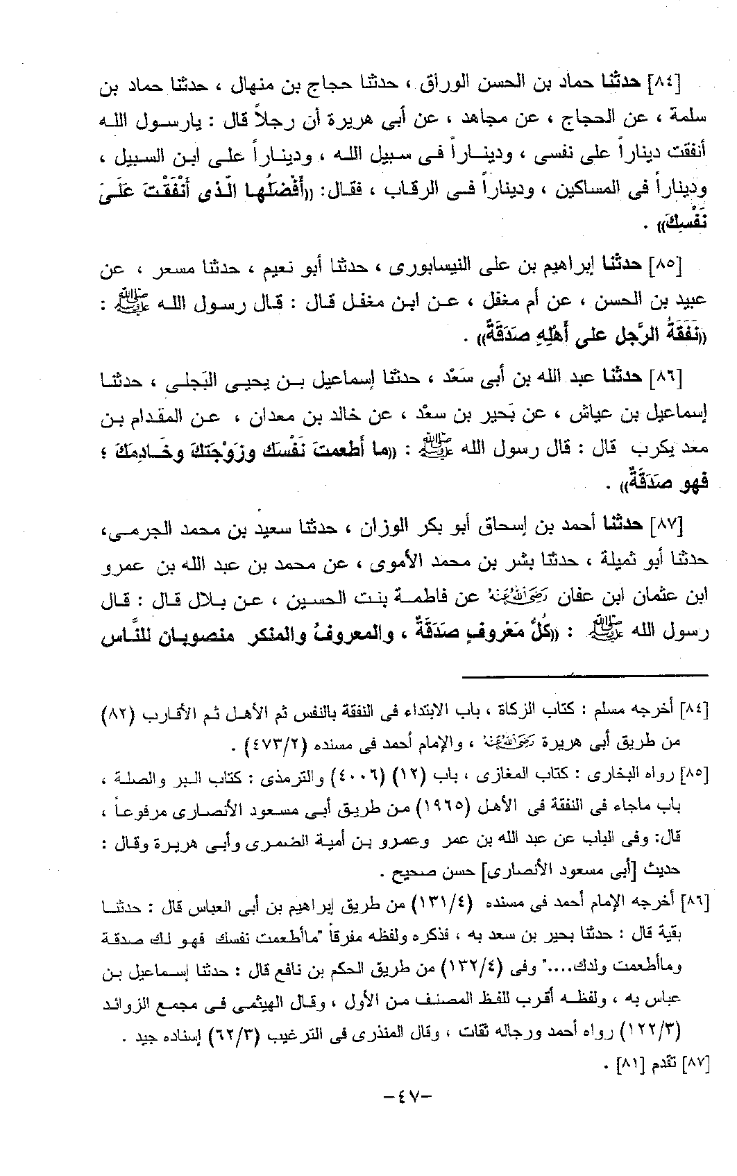 84 - حَدَّثَنَا حَمَّادُ بْنُ الْحَسَنِ الْوَرَّاقُ، حَدَّثَنَا حَجَّاجُ بْنُ مِنْهَالٍ، حَدَّثَنَا حَمَّادُ بْنُ سَلَمَةَ، عَنِ الْحَجَّاجِ، عَنْ مُجَاهِدٍ، عَنْ أَبِي هُرَيْرَةَ، أَنَّ رَجُلًا، قَالَ: يَا رَسُولَ اللَّهِ، " أَنْفَقْتُ دِينَارًا عَلَى نَفْسِي، وَدِينَارًا فِي سَبِيلِ اللَّهِ، وَدِينَارًا عَلَى ابْنِ السَّبِيلِ، وَدِينَارًا فِي الْمَسَاكِينِ، وَدِينَارًا فِي الرِّقَابِ فَقَالَ: §أَفْضَلُهَا الَّذِي أَنْفَقْتَ عَلَى نَفْسِكَ "