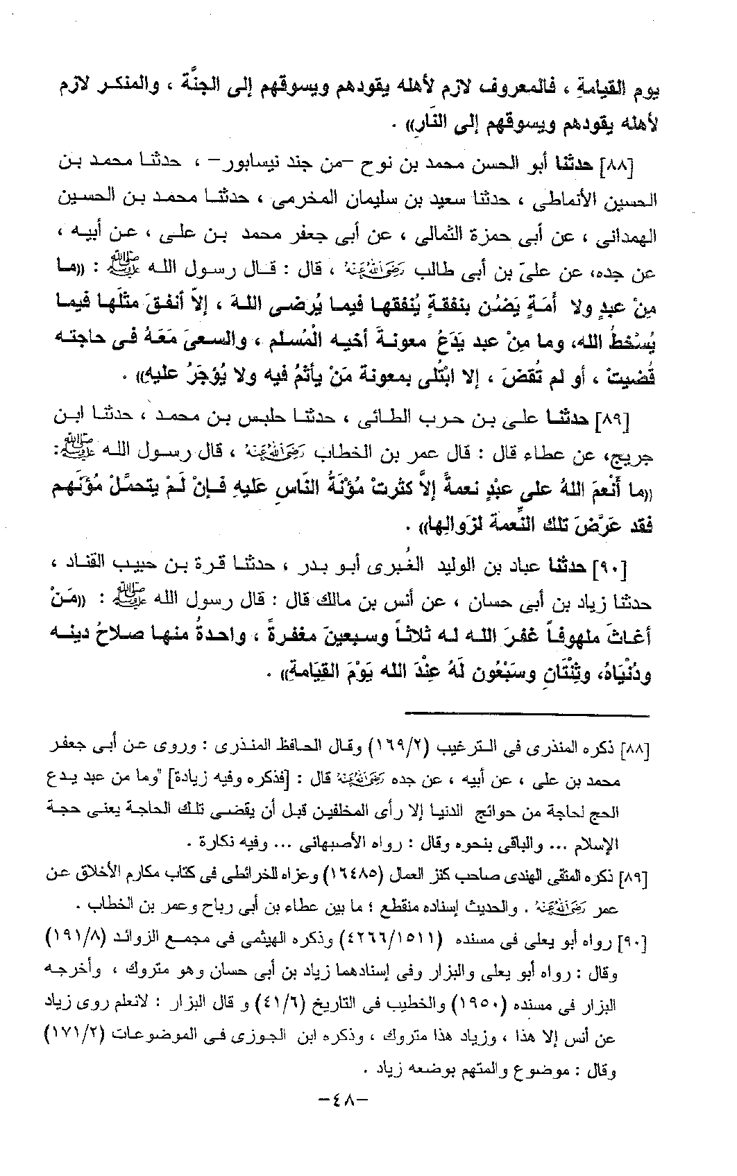 88 - حَدَّثَنَا أَبُو الْحَسَنِ مُحَمَّدُ بْنُ نُوحٍ مِنْ جُنْدِ نَيْسَابُورَ حَدَّثَنَا مُحَمَّدُ بْنُ الْحُسَيْنِ الْأَنْمَاطِيُّ، حَدَّثَنَا سَعِيدُ بْنُ سُلَيْمَانَ الْمُخَرِّمِيُّ، حَدَّثَنَا مُحَمَّدُ بْنُ الْحُسَيْنِ الْهَمْدَانِيُّ، عَنْ أَبِي حَمْزَةَ الثُّمَالِيُّ، عَنْ أَبِي جَعْفَرٍ مُحَمَّدِ بْنِ عَلِيٍّ، عَنْ أَبِيهِ، عَنْ جَدِّهِ، عَنْ عَلِيِّ بْنِ أَبِي طَالِبٍ، رَضِيَ اللَّهُ عَنْهُ قَالَ: قَالَ رَسُولُ اللَّهِ صَلَّى اللَّهُ عَلَيْهِ وَسَلَّمَ: «§مَا مِنْ عَبْدٍ وَلَا أَمَةٍ يَضِنُّ بِنَفَقَةٍ يُنْفِقُهَا فِيمَا يُرْضِي اللَّهَ، إِلَّا أَنْفَقَ مِثْلَهَا فِيمَا يُسْخِطُ اللَّهَ، وَمَا مِنْ عَبْدٍ يَدَعُ مَعُونَةَ أَخِيهِ الْمُسْلِمِ، وَالسَّعْيَ مَعَهُ فِي حَاجَتِهِ قُضِيَتْ، أَوْ لَمْ تُقْضَ إِلَّا ابْتُلِيَ بِمَعُونَةِ مَنْ يَأْثَمُ فِيهِ وَلَا يُؤْجَرُ عَلَيْهِ»
