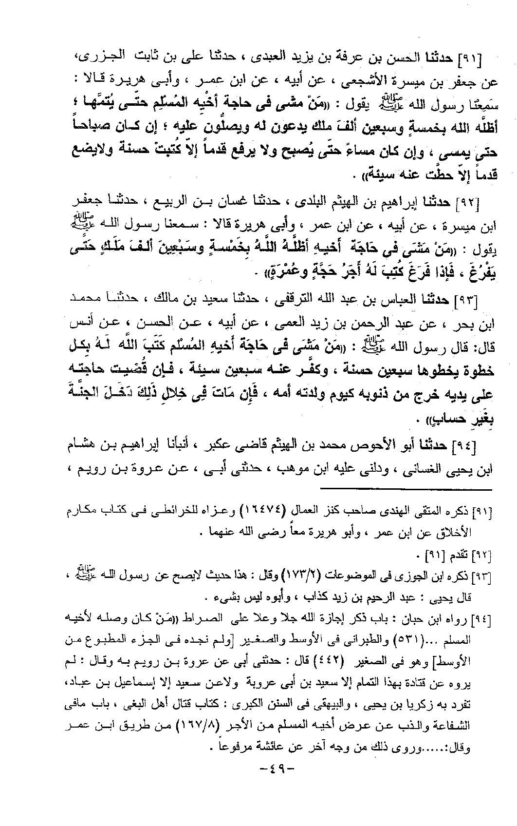 91 - حَدَّثَنَا الْحَسَنُ بْنُ عَرَفَةَ بْنِ يَزِيدَ الْعَبْدِيُّ، حَدَّثَنَا عَلِيُّ بْنُ ثَابِتٍ الْجَزَرِيُّ، عَنْ جَعْفَرِ بْنِ مَيْسَرَةَ الْأَشْجَعِيِّ، عَنْ أَبِيهِ، عَنِ ابْنِ عُمَرَ، وَأَبِي هُرَيْرَةَ قَالَا: سَمِعْنَا رَسُولَ اللَّهِ صَلَّى اللَّهُ عَلَيْهِ وَسَلَّمَ يَقُولُ: «§مَنْ مَشَى فِي حَاجَةِ أَخِيهِ الْمُسْلِمِ حَتَّى يُتِمَّهَا أَظَلَّهُ اللَّهُ بِخَمْسَةٍ وَسَبْعِينَ أَلْفَ مَلَكٍ يَدْعُونَ لَهُ، وَيُصَلُّونَ عَلَيْهِ، إِنْ كَانَ صَبَاحًا حَتَّى يُمْسِيَ، وَإِنْ كَانَ مَسَاءً حَتَّى يُصْبِحَ، وَلَا يَرْفَعُ قَدَمًا إِلَّا كُتِبَتْ حَسَنَةٌ، وَلَا يَضَعُ قَدَمًا إِلَّا حُطَّتْ عَنْهُ سَيِّئَةٌ»