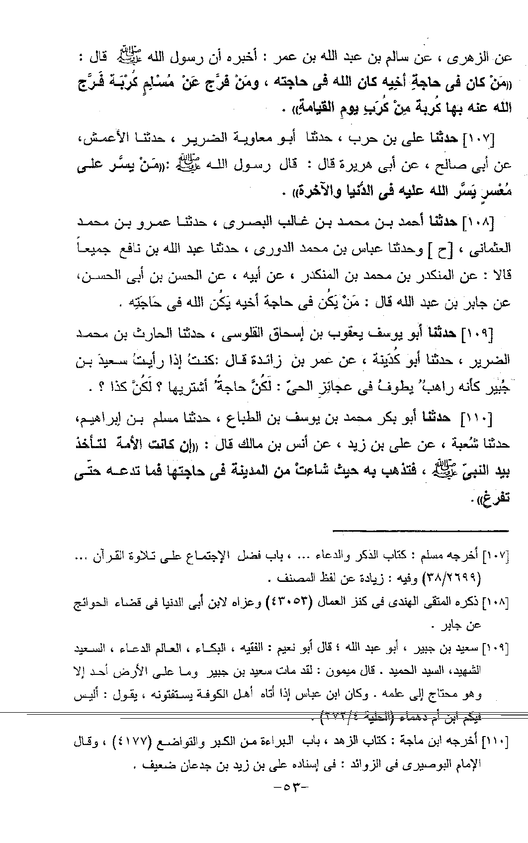 108 - حَدَّثَنَا أَحْمَدُ بْنُ مُحَمَّدِ بْنِ غَالِبٍ الْبَصْرِيُّ، حَدَّثَنَا عَمْرُو بْنُ مُحَمَّدٍ الْعُثْمَانِيُّ، ح وَحَدَّثَنَا عَبَّاسُ بْنُ مُحَمَّدٍ الدُّورِيُّ، حَدَّثَنَا عَبْدُ اللَّهِ بْنُ نَافِعٍ، جَمِيعًا قَالَا: عَنِ الْمُنْكَدِرِ بْنِ مُحَمَّدِ بْنِ الْمُنْكَدِرِ، عَنْ أَبِيهِ، عَنِ الْحَسَنِ بْنِ أَبِي الْحَسَنِ، عَنْ جَابِرِ بْنِ عَبْدِ اللَّهِ، قَالَ: «§مَنْ يَكُنْ فِي حَاجَةِ أَخِيهِ يَكُنِ اللَّهُ فِي حَاجَتِهِ»