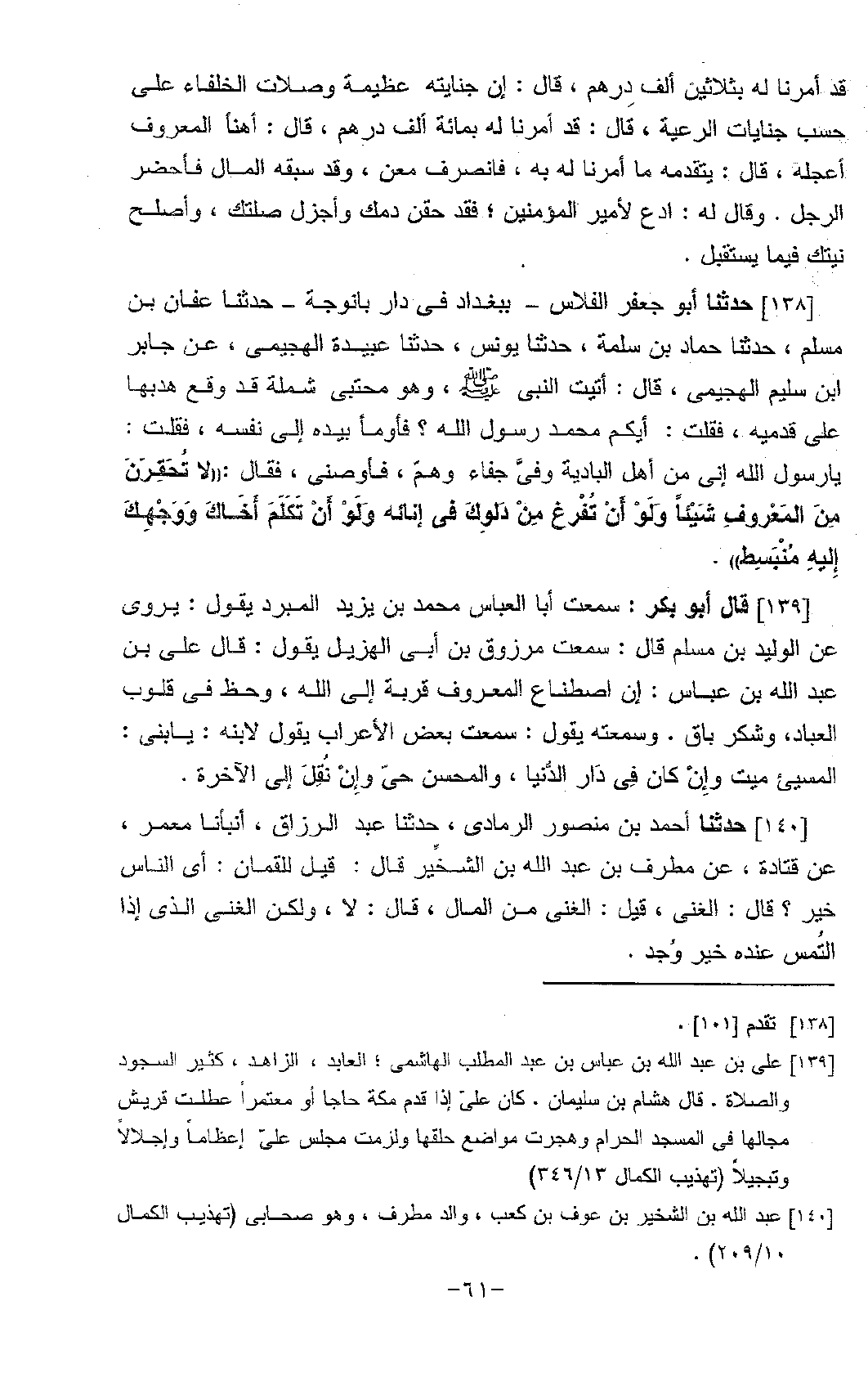 138 - حَدَّثَنَا أَبُو جَعْفَرٍ الْفَلَّاسُ، بِبَغْدَادَ فِي دَارِ بَانُوجَةَ، حَدَّثَنَا عَفَّانُ بْنُ مُسْلِمٍ، حَدَّثَنَا حَمَّادُ بْنُ سَلَمَةَ، حَدَّثَنَا يُونُسُ، حَدَّثَنَا عُبَيْدَةُ الْهُجَيْمِيُّ، عَنْ جَابِرِ بْنِ سُلَيْمٍ الْهُجَيْمِيِّ، قَالَ: أَتَيْتُ النَّبِيَّ صَلَّى اللَّهُ عَلَيْهِ وَسَلَّمَ، وَهُوَ مُحْتَبٍ شَمْلَةً، قَدْ وَقَعَ هُدْبُهَا عَلَى قَدَمَيْهِ، فَقُلْتُ: أَيُّكُمْ مُحَمَّدٌ رَسُولُ اللَّهِ؟ فَأَوْمَأَ بِيَدِهِ إِلَى نَفْسِهِ، فَقُلْتُ: يَا رَسُولَ اللَّهِ، إِنِّي مِنْ أَهْلِ الْبَادِيَةِ، وَفِيَّ جَفَاؤُهُمْ، فَأَوْصِنِي، فَقَالَ: «§لَا تَحْقِرَنَّ مِنَ الْمَعْرُوفِ شَيْئًا، وَلَوْ أَنْ تُفْرِغَ مِنْ دَلْوِكَ فِي إِنَائِهِ، وَلَوْ أَنْ تُكَلِّمَ أَخَاكَ وَوَجْهُكَ عَلَيْهِ مُنْبَسِطٌ»
