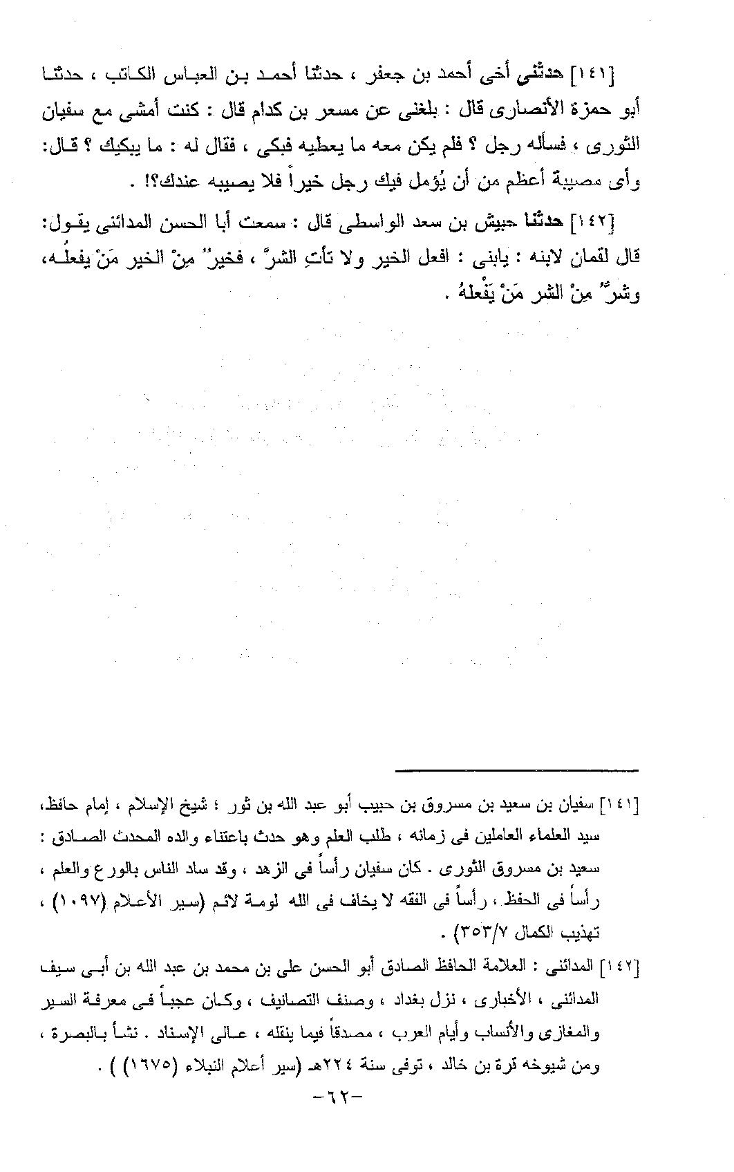 141 - حَدَّثَنِي أَخِي أَحْمَدُ بْنُ جَعْفَرٍ، حَدَّثَنَا أَحْمَدُ بْنُ الْعَبَّاسِ الْكَاتِبُ، حَدَّثَنَا أَبُو حَمْزَةَ الْأَنْصَارِيُّ، قَالَ: بَلَغَنِي عَنْ مِسْعَرِ بْنِ كِدَامٍ، قَالَ: " §كُنْتُ أَمْشِي مَعَ سُفْيَانَ الثَّوْرِيِّ، فَسَأَلَهُ رَجُلٌ، فَلَمْ يَكُنْ مَعَهُ مَا يُعْطِيهِ، فَبَكَى، فَقَالَ لَهُ: مَا يُبْكِيكَ؟ قَالَ: وَأَيُّ مُصِيبَةٍ أَعْظَمُ مِنْ أَنْ يُؤَمِّلَ فِيكَ رَجُلٌ خَيْرًا، فَلَا يُصِيبَهُ عِنْدَكَ؟ "