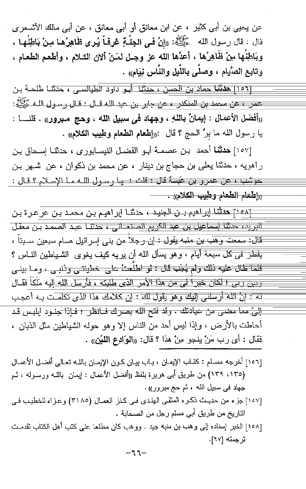 156 - حَدَّثَنَا حَمَّادُ بْنُ الْحَسَنِ، حَدَّثَنَا أَبُو دَاوُدَ الطَّيَالِسِيُّ، حَدَّثَنَا طَلْحَةُ بْنُ عَمْرٍو، عَنْ مُحَمَّدِ بْنِ الْمُنْكَدِرِ، عَنْ جَابِرِ بْنِ عَبْدِ اللَّهِ، قَالَ: قَالَ رَسُولُ اللَّهِ صَلَّى اللَّهُ عَلَيْهِ وَسَلَّمَ: " §أَفْضَلُ الْأَعْمَالِ: إِيمَانٌ بِاللَّهِ، وَجِهَادٌ فِي سَبِيلِ اللَّهِ، وَحَجٌّ مَبْرُورٌ " قُلْنَا: يَا رَسُولَ اللَّهِ، مَا بِرُّ الْحَجِّ؟ قَالَ: «إِطْعَامُ الطَّعَامِ، وَطِيبُ الْكَلَامِ»