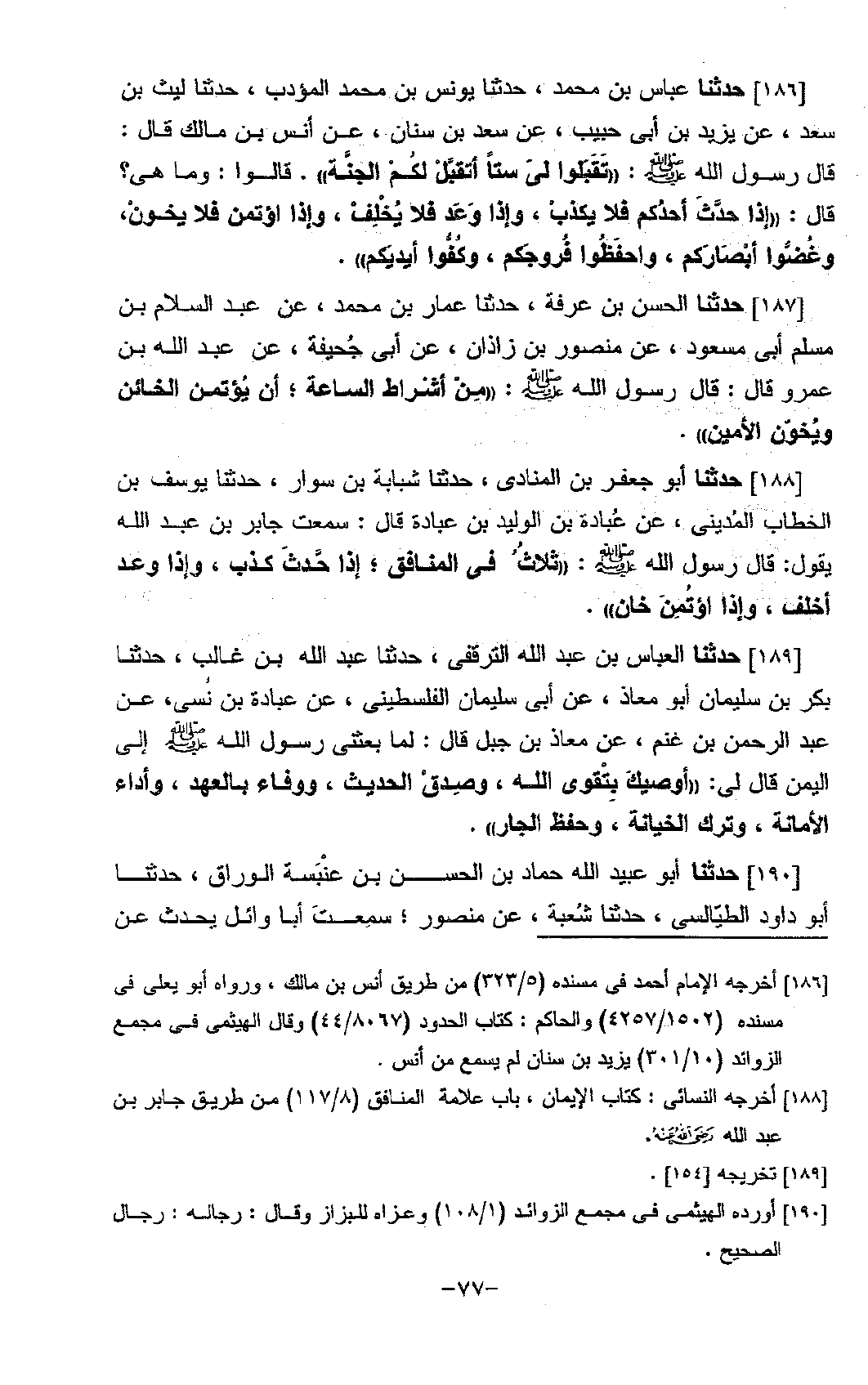 190 - حَدَّثَنَا أَبُو عُبَيْدِ اللَّهِ حَمَّادُ بْنُ الْحَسَنِ بْنِ عَنْبَسَةَ الْوَرَّاقُ، حَدَّثَنَا أَبُو دَاوُدَ الطَّيَالِسِيُّ، حَدَّثَنَا شُعْبَةُ، عَنْ مَنْصُورٍ، سَمِعْتُ أَبَا وَائِلٍ، يُحَدِّثُ عَنْ -[78]- عَبْدِ اللَّهِ بْنِ مَسْعُودٍ، عَنِ النَّبِيِّ صَلَّى اللَّهُ عَلَيْهِ وَسَلَّمَ قَالَ: " §ثَلَاثٌ مَنْ كُنَّ فِيهِ فَهُوَ مُنَافِقٌ، وَمَنْ كَانَتْ فِيهِ خَصْلَةٌ مِنْهَا فَفِيهِ خَصْلَةٌ مِنَ النِّفَاقِ: إِذَا حَدَّثَ كَذَبَ، وَإِذَا اؤْتُمِنَ خَانَ، وَإِذَا وَعَدَ أَخْلَفَ "