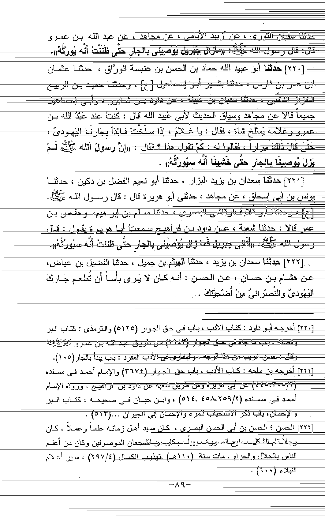 220 - حَدَّثَنَا أَبُو عُبَيْدِ اللَّهِ حَمَّادُ بْنُ الْحَسَنِ بْنِ عَنْبَسَةَ الْوَرَّاقُ، حَدَّثَنَا عُثْمَانُ بْنُ عُمَرَ بْنِ فَارِسٍ، حَدَّثَنَا بَشِيرٌ أَبُو إِسْمَاعِيلَ، ح، وَحَدَّثَنَا حُمَيْدُ بْنُ الرَّبِيعِ الْخَزَّازُ اللَّخْمِيُّ، حَدَّثَنَا سُفْيَانُ بْنُ عُيَيْنَةَ، عَنْ دَاوُدَ بْنِ شَابُورَ، وَأَبِي إِسْمَاعِيلَ، جَمِيعًا قَالَا عَنْ مُجَاهِدٍ، وَسِيَاقُ الْحَدِيثِ لِأَبِي عُبَيْدِ اللَّهِ قَالَ: " §كُنْتُ عِنْدَ عَبْدِ اللَّهِ بْنِ عَمْرٍو وَغُلَامُهُ يَسْلُخُ شَاةً، فَقَالَ: يَا غُلَامُ، إِذَا سَلَخْتَ فَابْدَأْ بِجَارِنَا الْيَهُودِيِّ حَتَّى قَالَ ذَلِكَ مِرَارًا، فَقَالُوا لَهُ: كَمْ تَقُولُ هَذَا؟ فَقَالَ: إِنَّ رَسُولَ اللَّهِ صَلَّى اللَّهُ عَلَيْهِ وَسَلَّمَ لَمْ يَزَلْ يُوصِينَا بِالْجَارِ حَتَّى خَشِينَا أَنَّهُ سَيُوَرِّثُهُ "