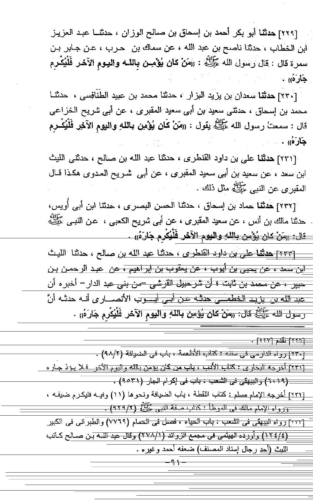 229 - حَدَّثَنَا أَبُو بَكْرٍ أَحْمَدُ بْنُ إِسْحَاقَ بْنِ صَالِحٍ الْوَزَّانُ، حَدَّثَنَا عَبْدُ الْعَزِيزِ بْنُ الْخَطَّابِ، حَدَّثَنَا نَاصِحُ بْنُ عَبْدِ اللَّهِ، عَنْ سِمَاكِ بْنِ حَرْبٍ، عَنْ جَابِرِ بْنِ سَمُرَةَ، قَالَ: قَالَ رَسُولُ اللَّهِ صَلَّى اللَّهُ عَلَيْهِ وَسَلَّمَ: «§مَنْ كَانَ يُؤْمِنُ بِاللَّهِ وَالْيَوْمِ الْآخِرِ فَلْيُكْرِمْ جَارَهُ»