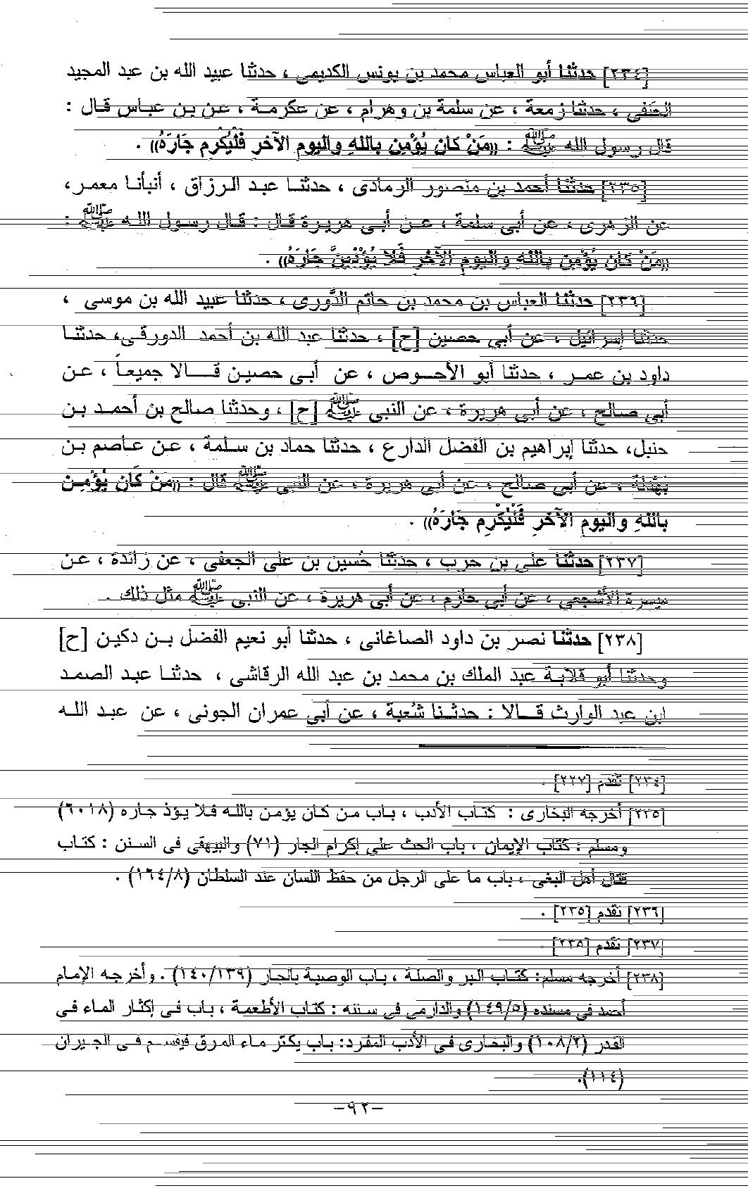 236 - حَدَّثَنَا الْعَبَّاسُ بْنُ مُحَمَّدِ بْنِ حَاتِمٍ الدُّورِيُّ، حَدَّثَنَا عُبَيْدُ اللَّهِ بْنُ مُوسَى، حَدَّثَنَا إِسْرَائِيلُ، عَنْ أَبِي حَصِينٍ ح، حَدَّثَنَا عَبْدُ اللَّهِ بْنُ أَحْمَدَ الدَّوْرَقِيُّ، حَدَّثَنَا دَاوُدُ بْنُ عُمَرَ، حَدَّثَنَا أَبُو الْأَحْوَصِ، عَنْ أَبِي حَصِينٍ، قَالَا جَمِيعًا، عَنْ أَبِي صَالِحٍ، عَنْ أَبِي هُرَيْرَةَ، عَنِ النَّبِيِّ صَلَّى اللَّهُ عَلَيْهِ وَسَلَّمَ. ح.، وَحَدَّثَنَا صَالِحُ بْنُ أَحْمَدَ بْنِ حَنْبَلٍ، حَدَّثَنَا إِبْرَاهِيمُ بْنُ الْفَضْلِ الدَّارِعُ، حَدَّثَنَا حَمَّادُ بْنُ سَلَمَةَ، عَنْ عَاصِمِ ابْنِ بَهْدَلَةَ، عَنْ أَبِي صَالِحٍ، عَنْ أَبِي هُرَيْرَةَ، عَنِ النَّبِيِّ صَلَّى اللَّهُ عَلَيْهِ وَسَلَّمَ قَالَ: «§مَنْ كَانَ يُؤْمِنُ بِاللَّهِ وَالْيَوْمِ الْآخِرِ فَلْيُكْرِمْ جَارَهُ»