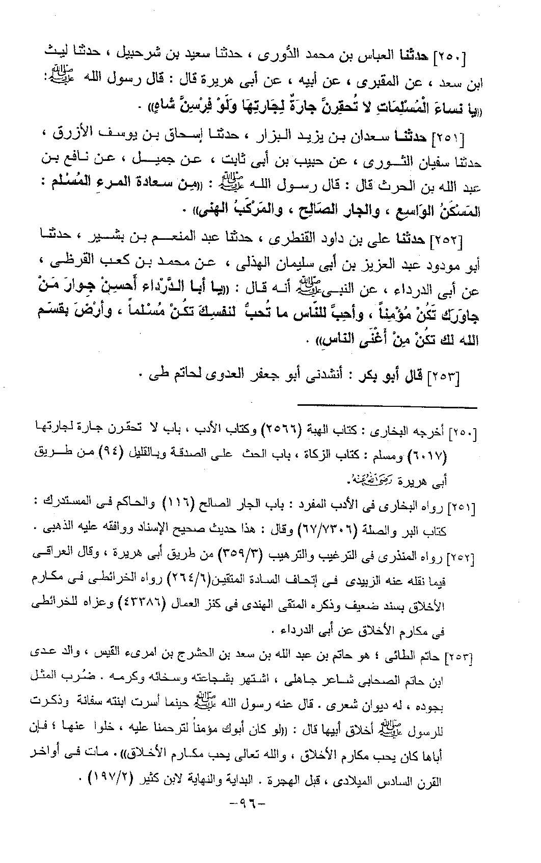 252 - حَدَّثَنَا عَلِيُّ بْنُ دَاوُدَ الْقَنْطَرِيُّ، حَدَّثَنَا عَبْدُ الْمُنْعِمِ بْنُ بَشِيرٍ، حَدَّثَنَا أَبُو مَوْدُودٍ عَبْدُ الْعَزِيزِ بْنُ أَبِي سُلَيْمَانَ الْهُذَلِيُّ، عَنْ مُحَمَّدِ بْنِ كَعْبٍ الْقُرَظِيِّ، عَنْ أَبِي الدَّرْدَاءِ، عَنِ النَّبِيِّ صَلَّى اللَّهُ عَلَيْهِ وَسَلَّمَ أَنَّهُ قَالَ: يَا أَبَا الدَّرْدَاءِ، «§أَحْسِنْ جِوَارَ مَنْ جَاوَرَكَ تَكُنْ مُؤْمِنًا، وَأَحِبَّ لِلنَّاسِ مَا تُحِبُّ لِنَفْسِكَ تَكُنْ مُسْلِمًا، وَارْضَ بِقَسْمِ اللَّهِ لَكَ تَكُنْ مِنْ أَغْنَى النَّاسِ» ،