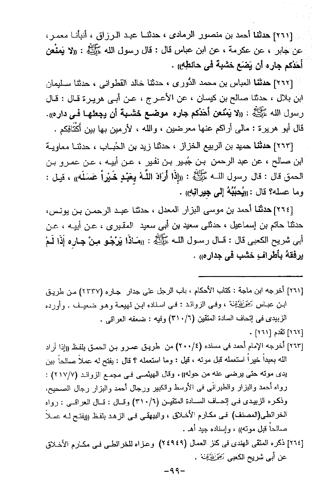264 - حَدَّثَنَا أَحْمَدُ بْنُ مُوسَى الْبَزَّارُ الْمُعَدَّلُ، حَدَّثَنَا عَبْدُ الرَّحْمَنِ بْنُ يُونُسَ، حَدَّثَنَا حَاتِمُ بْنُ إِسْمَاعِيلَ، حَدَّثَنِي سَعِيدُ بْنُ أَبِي سَعِيدٍ الْمَقْبُرِيُّ، عَنْ أَبِيهِ، عَنْ أَبِي شُرَيْحٍ الْكَعْبِيِّ، قَالَ: قَالَ رَسُولُ اللَّهِ صَلَّى اللَّهُ عَلَيْهِ وَسَلَّمَ: «§مَاذَا يَرْجُو مِنْ جَارِهِ إِذَا لَمْ يَرْفُقْهُ بِأَطْرَافِ خَشَبٍ فِي جِدَارِهِ»