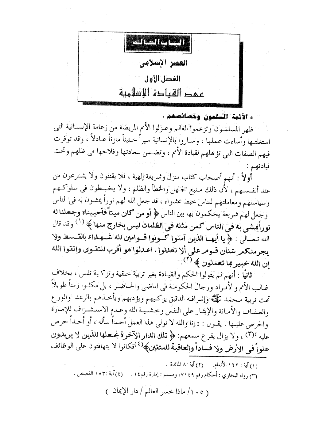ظهر المسلمون وتزعموا العالم وعزلوا الأمم المريضة من زعامة الإنسانية التي استغلتها وأساءت عملها، وساروا بالإنسانية سيراً حثيثاً متزناً عادلاً، وقد توفرت فيهم الصفات التي تؤهلهم لقيادة الأمم، وتضمن سعادتها وفلاحها في ظلهم وتحت قيادتهم.