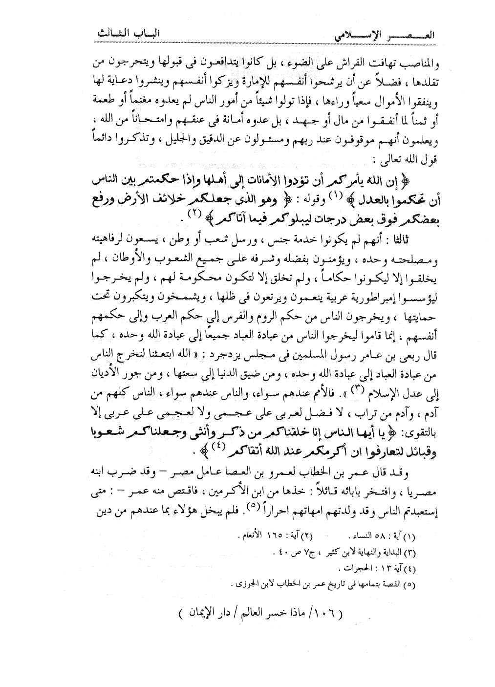 وقد قال عمر بن الخطاب لعمرو بن العاص عامل مصر- وقد ضرب ابنه مصرياً، وافتخر بآبائه قائلاً: خذها من ابن الأكرمين، فاقتص منه عمر-: متى استعبدتم الناس وقد ولدتهم أمهاتهم أحراراً (¬3) . فلم يبخل هؤلاء بما عندهم من دين