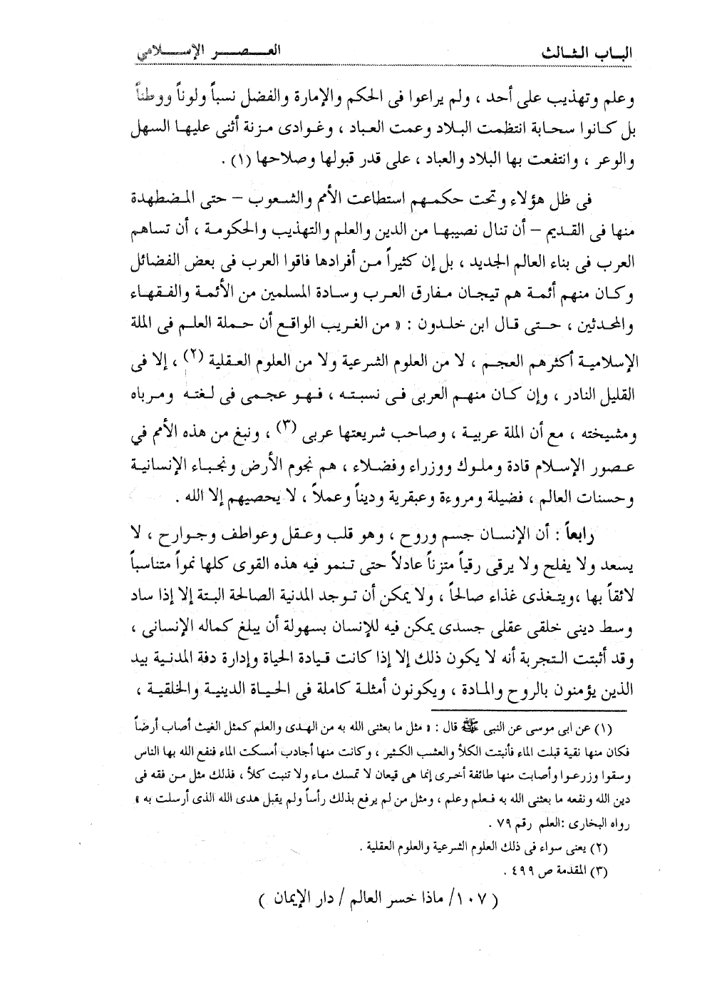 في ظل هؤلاء وتحت حكمهم استطاعت الأمم والشعوب - حتى المضطهدة منها في القديم- أن تنال نصيبها من الدين والعلم والتهذيب والحكومة، أن تساهم العرب في بناء العالم الجديد بل إن كثيراً من أفرادها فاقوا العرب في بعض الفضائل، وكان منهم أئمة هم تيجان مفارق العرب وسادة المسلمين من الأئمة والفقهاء والمحدثين، حتى قال ابن خلدون: ((من الغريب الواقع أن حملة العلم في الملة الإسلامية أكثرهم العجم، لا من العلوم الشرعية ولا من العلوم العقلية (¬2) ، إلا في القليل النادر، وإن كان منهم العربي في نسبته، فهو عجمي في لغته، ومرباه ومشيخته، مع أن الملة عربية، وصاحب شريعتها عربي (¬3)) . ونبغ من هذه الأمم في عصور الإسلام قادة وملوك ووزراء وفضلاء، هم نجوم الأرض ونجباء الإنسانية، وحسنات العالم، فضيلة ومروءة وعبقرية وديناً وعملاً، لا يحصيهم إلا الله.