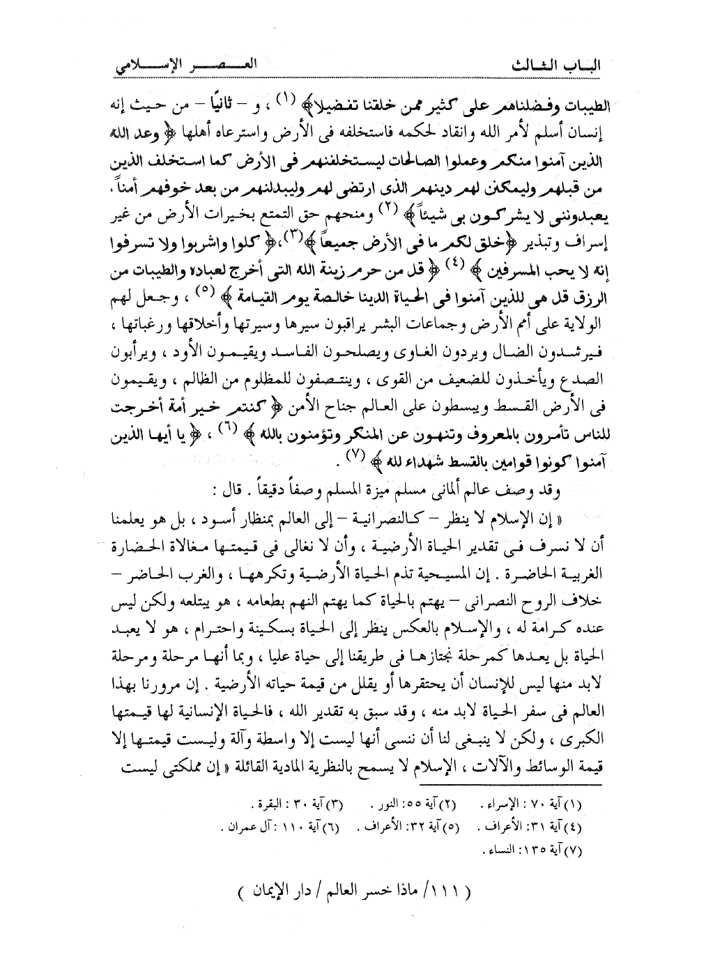 ((إن الإسلام لا ينظر- كالنصرانية - إلى العالم بمنظار أسود، بل هو يعلمنا أن لا نسرف في تقدير الحياة الأرضية، وأن لا نغالي في قيمتها مغالاة الحضارة الغربية الحاضرة. إن المسحية تذم الحياة الأرضية وتكرهها، والغرب الحاضر-خلاف الروح النصراني - يهتم بالحياة كما يهتم النهم بطعامه، هو يبتلعه ولكن ليس عنده كرامة له، والإسلام بالعكس ينظر إلى الحياة بسكينه واحترام، هو لا يبعد الحياة بل يعدها كمرحلة نجتازها في طريقنا إلى حياة عليا، وبما أنها مرحلة ومرحلة لابد منها ليس للإنسان أن يحتقرها أو يقلل من قيمة حياته الأرضية. إن مرورنا بهذا العالم في سفر الحياة لابد منه، وقد سبق به تقدير الله، فالحياة الإنسانية لها قيمتها الكبرى، ولكن لا ينبغي لنا أن ننسى أنها ليست إلا واسطة وآلة وليست قيمتها إلا
