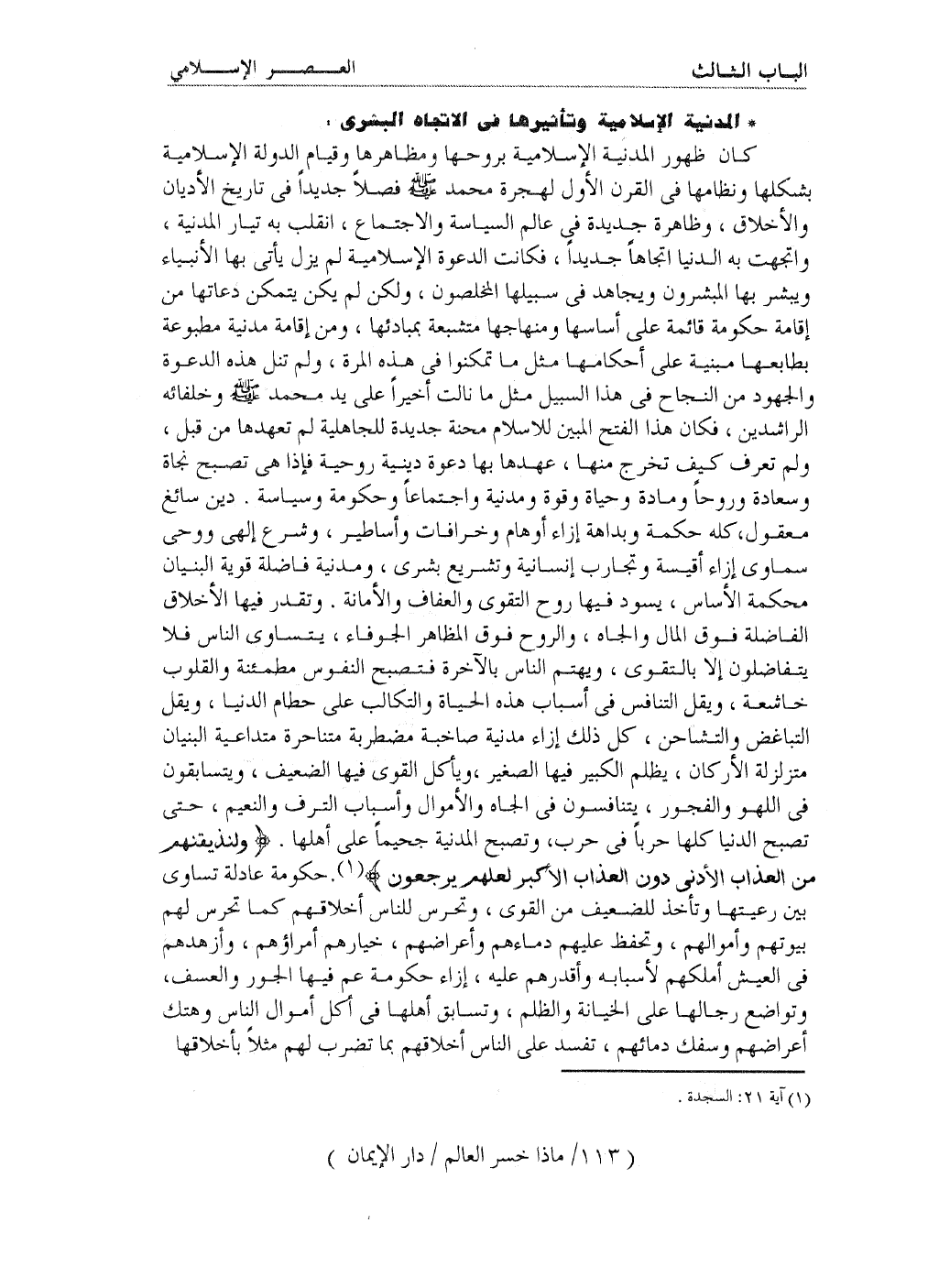 كان ظهور المدنية الإسلامية بروحها ومظاهرها وقيام الدولة الإسلامية بشكلها ونظامها في القرن الأول لهجرة محمد صلى الله عليه وسلم فصلاً جديداً في تاريخ الأديان والأخلاق، وظاهرة جديدة في عالم السياسة والاجتماع، انقلب به تيار المدنية، واتجهت به الدنيا اتجاهاً جديداً، فكانت الدعوة الإسلامية لم يزل يأتي بها الأنبياء ويبشر بها المبشرون ويجاهد في سبيلها المخلصون، ولكن لم يكن يتمكن دعاتها من إقامة حكومة قائمة على أساسها ومناهجها متشبعة بمبادئها، ومن إقامة مدنية مطبوعة بطابعها مبنية على أحكامها مثل ما تمكنوا في هذه المرة، ولم تنل هذه الدعوة والجهود من النجاح في هذا السبيل مثل ما نالت أخيراً على يد محمد صلى الله عليه وسلم وخلفائه الراشدين، فكان هذا الفتح المبين للإسلام محنة جديدة للجاهلية لم تعهدها من قبل، ولم تعرف كيف تخرج منها، عهدها بها دعوة دينية روحية فإذا هي تصبح نجاة وسعادة وروحاً ومادة وحياة وقوة ومدنية واجتماعاً وحكومة وسياسة. دين سائغ معقول كله حكمة وبداهة إزاء أوهام وخرافات وأساطير، وشرع إلهي ووحي سماوي إزاء أقيسة وتجارب إنسانية وتشريع بشري، ومدنية فاضلة قوية البنيان محكمة الأساس، يسود فيها روح التقوى والعفاف والأمانة، وتقدر فيها الأخلاق الفاضلة فوق المال والجاه، والروح فوق المظاهر الجوفاء، يتساوى الناس فلا يتفاضلون إلا بالتقوى، ويهتم الناس بالآخرة فتصبح النفوس مطمئنة والقلوب خاشعة، ويقل التنافس في أسباب هذه الحياة والتكالب على حطام الدنيا، ويقل التباغض والتشاحن، كل ذلك إزاء مدنية صاخبة مضطربة متناحرة متداعية البنيان متزلزلة الأركان، يظلم الكبير فيها الصغير، ويأكل القوي فيها الضعيف، ويتسابقون في اللهو والفجور، يتنافسون ف الجاه والأموال وأسباب الترف والنعيم، حتى تصبح الدنيا كلها حرباً في حرب وتصبح المدنية جحيماً على