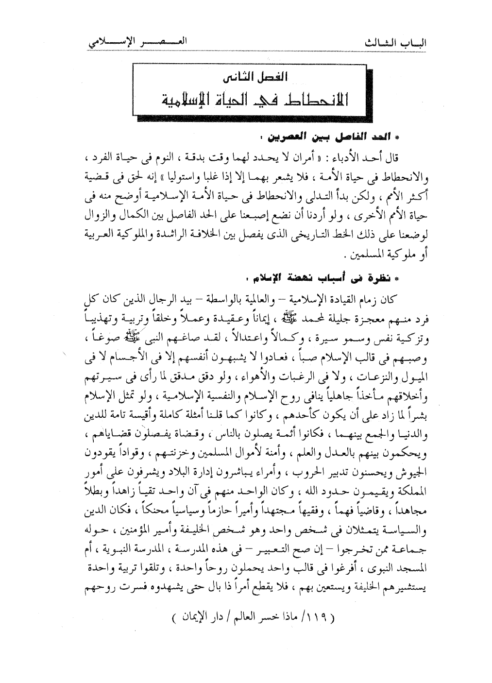 قال أحد الأدباء: ((أمران لا يحدد لهما وقت بدقة، النوم في حياة الفرد، والانحطاط في حياة الأمة، فلا يشعر بهما إلا إذا غلبا واستوليا)) إنه لحق في قضية أكثر الأمم، ولكن بدأ التدلّي والانحطاط في حياة الأمة الإسلامية أوضح منه في حياة الأمم الأخرى، ولو أردنا أن نضع إصبعنا على الحد الفاصل بين الكمال والزوال لوضعنا على ذلك الخط التاريخي الذي يفصل بين الخلافة الراشدة والملوكية العربية أو ملوكية المسلمين.