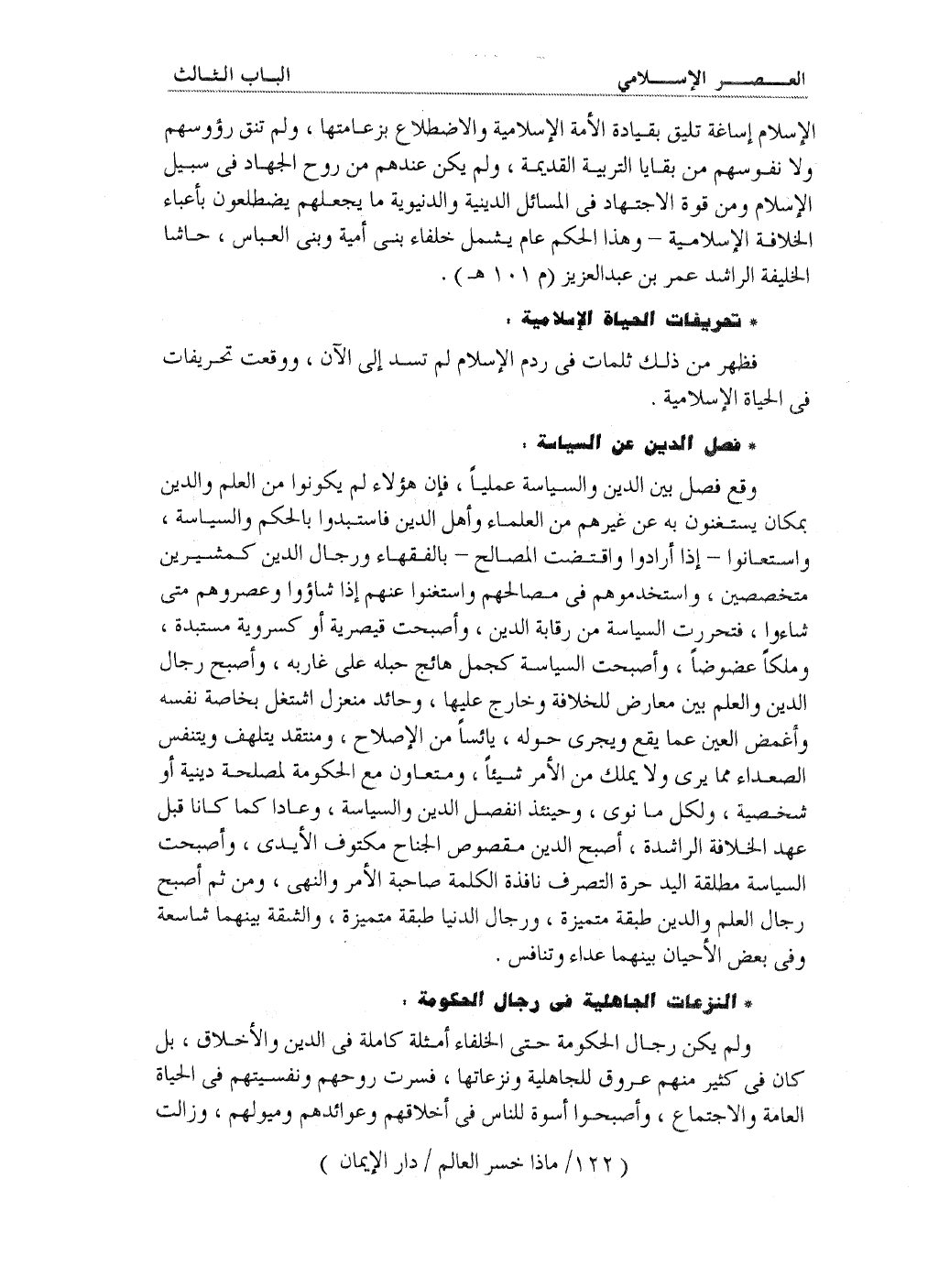 هائج حبله على غاربه، وأصبح رجال الدين والعلم بين معرضة للخلافة وخارج عليها، وحائد منعزل اشتغل بخاصة نفسه وأغمض العين عما يقع ويجري حوله، يائساً من الإصلاح، ومنتقد يتلهف ويتنفس الصعداء مما يرى ولا يملك من الأمر شيئاً، ومتعاون مع الحكومة لمصلحة دينية أو شخصية، ولكلٍّ ما نوى، وحينئذ انفصل الدين والسياسة، وعادا كما كانا قبل عهد الخلافة الراشدة أصبح الدين مقصوص الجناح مكتوف الأيدي، وأصبحت السياسة مطلقة اليد حرة التصرف نافذة الكلمة صاحبة الأمر والنهي، ومن ثمَّ أصبح رجال العلم والدين طبقة متميزة، ورجال الدنيا طبقة متميزة، والشقة بينهما شاسعة، وفي بعض الأحيان بينهما عداء وتنافس.