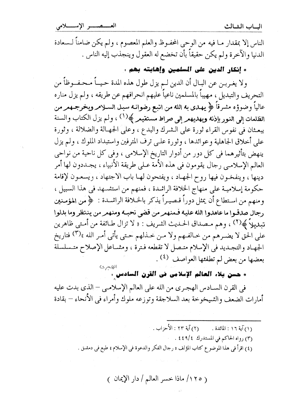 ولا يغربن عن البال أن الدين لم يزل طول هذه المدة حياً محفوظاً من التحريف والتبديل، مهيباً بالمسلمين ناعياً عليهم انحرافهم عن طريقه، ولم يزل مناره عالياً وضوءه مشرقاً {يَهْدِي بِهِ اللهُ مَنِ اتَّبَعَ رِضْوَانَهُ سُبُلَ السَّلاَمِ وَيُخْرِجُهُم مِّنِ الظُّلُمَاتِ إِلَى النُّورِ بِإِذْنِهِ وَيَهْدِيهِمْ إِلَى صِرَاطٍ مُّسْتَقِيمٍ} ولم يزل الكتاب والسنة يبعثان في نفوس القراء ثورة على الشرك والبدع، وعلى الجهالة والضلالة وثورة على أخلاق الجاهلية وعوائدها، وثورة على ترف المترفين واستبداد الملوك، ولم يزل ينهض بتأثيرهما في كل دور من أدوار التاريخ الإسلامي، وفي كل ناحية من نواحي العالم الإسلامي رجال يقومون في هذه الأمة على طريق الأنبياء، يجددون لها أمر دينها، وينفخون فيها روح الجهاد، ويفتحون لها باب الاجتهاد، ويسعون لإقامة حكومة إسلامية على منهاج الخلافة الراشدة، فمنهم من استشهد في هذه السبيل، ومنهم من استطاع أن يمثل دوراً قصيراً يذكر بالخلافة الراشدة: {مِنَ الْمُؤْمِنِينَ رِجَالٌ صَدَقُوا مَا عَاهَدُوا اللَّهَ عَلَيْهِ فَمِنْهُم مَّن قَضَى نَحْبَهُ وَمِنْهُم مَّن يَنتَظِرُ وَمَا بَدَّلُوا تَبْدِيلاً} وهم مصداق الحديث الشريف: ((لا تزال طائفة من أمتي ظاهرين على الحق لا يضرهم من خالفهم ولا من خذلهم حتى يأتي أمر الله)) فتاريخ الجهاد والتجديد في الإسلام متصل لا تقطعه فترة، ومشاعل الإصلاح متسلسلة بعضها من بعض لم تطفئها العواصف (¬1) .
