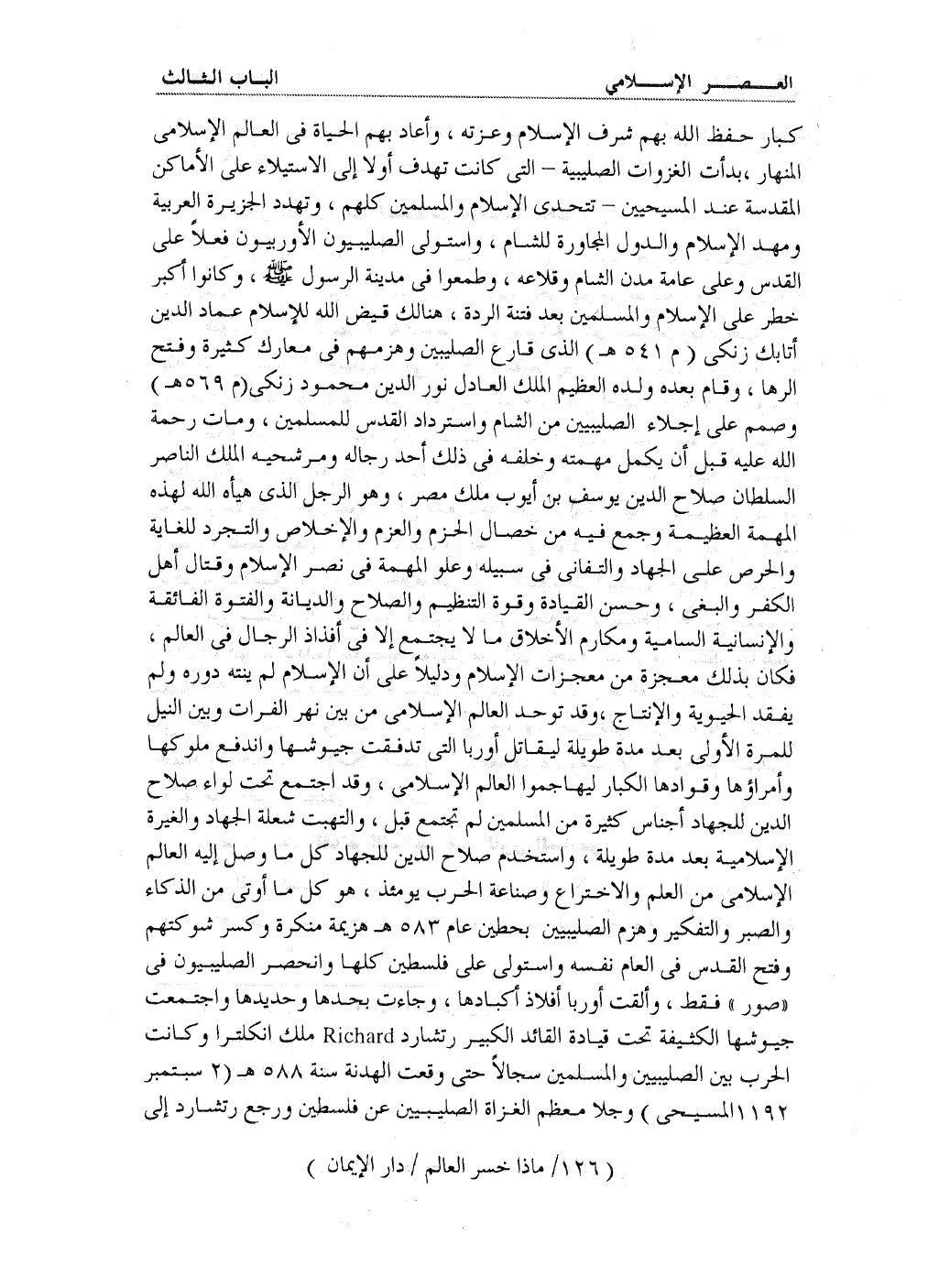 مدينة الرسول صلى الله عليه وسلم، وكانوا أكبر خطر على الإسلام والمسلمين بعد فتنة الردة، هنالك قيض الله للإسلام عماد الدين أتابك زنكي (م 541هـ) الذي قارع الصليبيين وهزمهم في معارك كثيرة وفتح الرُّها، وقام بعده ولده العظيم الملك العادل نور الدين محمود زنكي (م 569هـ) وصمم على إجلاء الصليبيين من الشام واسترداد القدس للمسلمين، ومات رحمة الله عليه قبل أن يكمل مهمته وخلفه في ذلك أحد رجاله ومرشحيه الملك الناصر السلطان صلاح الدين يوسف بن أيوب ملك مصر، وهو الرجل الذي هيأه الله لهذه المهمة العظيمة وجمع فيه من خصال الحزم والعزم والإخلاص والتجرد للغاية والحرص على الجهاد والتفاني في سبيله وعلو الهمة في نصر الإسلام وقتال أهل الكفر والبغي، وحسن القيادة وقوة التنظيم والصلاح والديانة والفتوة الفائقة والإنسانية السامية ومكارم الأخلاق ما لا يجتمع إلا في أفذاذ الرجال في العالم، فكان بذلك معجزة من معجزات الإسلام ودليلاً على أن الإسلام لم ينته دوره ولم يفقد الحيوية والإنتاج، وقد توحد العالم الإسلامي من بين نهر الفرات وبين النيل للمرة الأولى بعد مدة طويلة ليقاتل أوربا التي تدفقت جيوشها واندفع ملوكها وأمراؤها وقوادها الكبار ليهاجموا العالم الإسلامي، وقد اجتمع تحت لواء صلاح الدين للجهاد أجناس كثيرة من المسلمين لم تجتمع قبل، والتهبت شعلة الجهاد والغيرة الإسلامية بعد مدة طويلة، واستخدم صلاح الدين للجهاد كل ما وصل إليه العالم الإسلامي من العلم والاختراع وصناعة الحرب يومئذ، هو كل ما أوتي من الذكاء والصبر والتفكير وهزم الصليبيين في حطين عام (583هـ) هزيمة منكرة وكسر شوكتهم وفتح القدس في العام نفسه واستولى على فلسطين لها وانحصر الصليبيون في " صور" فقط، ألقت أوربا أفلاذ أكبادها، وجاءت بحدها وحديدها واجتمعت جيوشها الكثيفة تحت قيادة القائد الكبير رتشارد Richard ملك انكلترا وكانت الحرب بين الصليبيين والمسلمين سجالاً حتى وقعت الهدنة سنة 588هـ (2 سبتمبر 1192 المسيحي) وجلا معظم الغزاة الصليبيين عن فلسطين ورجع رتشارد إلى