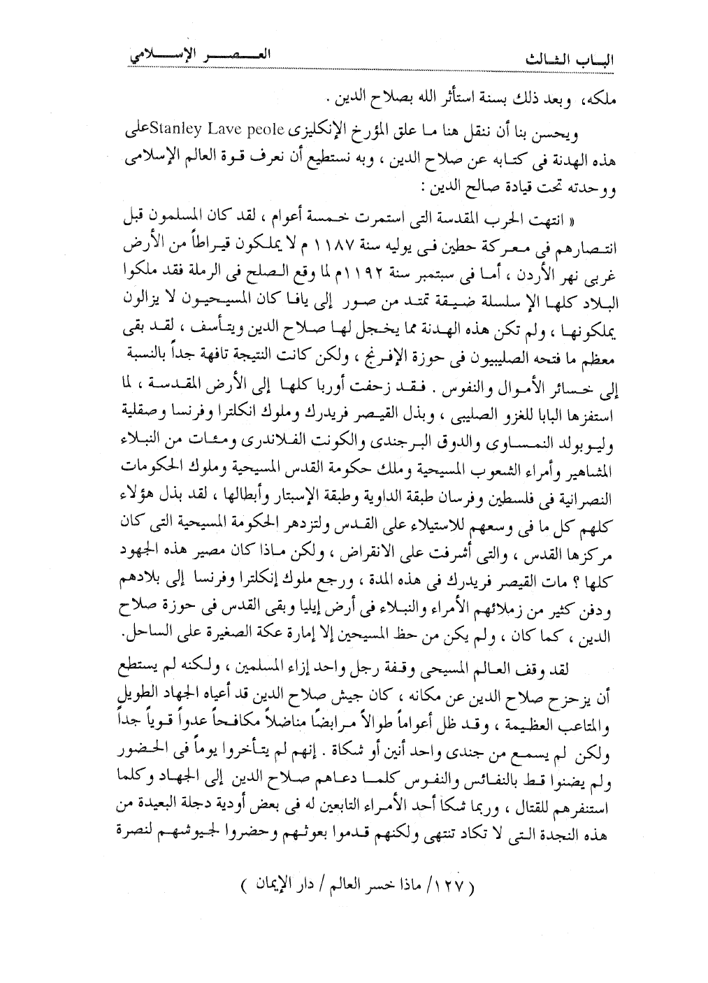 ((انتهت الحرب المقدسة التي استمرت خمسة أعوام، لقد كان المسلمون قبل انتصارهم في معركة حطين في يوليه سنة 1187م ولا يملكون قيراطاً من الأرض غربي نهر الأردن، أما في سبتمبر سنة 1192م لما وقع الصلح في الرملة فقد ملكوا البلاد كلها إلا سلسلة ضيقة تمتد من صور إلى يافا كان المسيحيون لا يزالون يملكونها، ولم تكن هذه الهدنة مما يخجل لها صلاح الدين ويتأسف، لقد بقي معظم ما فتحه الصليبيون في حوزة الإفرنج، ولكن كانت النتيجة تافهة جداً بالنسبة إلى خسائر الأموال والنفوس. فقد زحفت أوربا كلها إلى الأرض المقدسة لما استفزها البابا للغزو الصليبي، وبذل القيصر فريدرك وملوك انكلترا وفرنسا وصقلية وليوبولد النمساوي والدوق البرجندي والكونت الفلاندري مئات من النبلاء والمشاهير وأمراء الشعوب المسيحية وملك حكومة القدس المسيحية وملوك الحكومات النصرانية في فلسطين وفرسان طبقة الداوية وطبقة الإسبتار وأبطالها، لقد بذل هؤلاء كلهم كل ما في وسعهم للاستيلاء على القدس ولتزدهر الحكومة المسيحية التي كانت مركزها القدس، والتي أشرفت على الانقراض. ولكن ماذا كان مصير هذه الجهود كلها؟ مات القيصر فريدرك في هذه المدة، ورجع ملوك انكلترا وفرنسا إلى بلادهم ودفن كثير من زملائهم الأمراء والنبلاء في أرض إيليا وبقي القدس في حوزة صلاح الدين، كما كان، ولم يكن من حظ المسيحيين إلا إمارة عكة الصغيرة على الساحل.