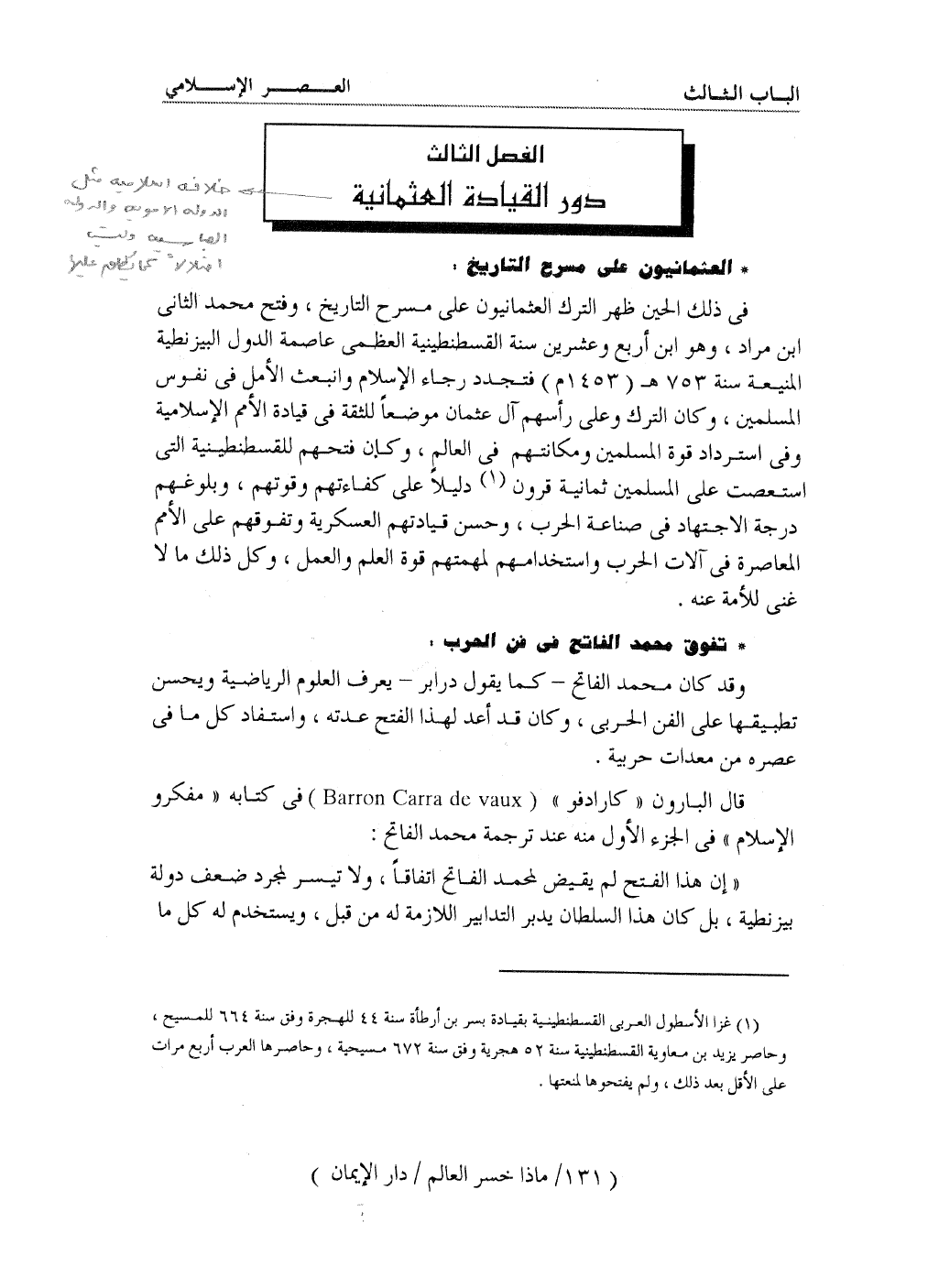 في ذلك الحين ظهر الترك العثمانيون على مسرح التاريخ، وفتح محمد الثاني بن مراد، وهو ابن أربع وعشرين سنة القسطنطينية العظمى عاصمة الدول البيزنطية المنيعة سنة 753هـ (1453 م) فتجدد رجاء الإسلام وانبعث الأمل في نفوس المسلمين، وكان الترك وعلى رأسهم آل عثمان موضعاً للثقة في قيادة الأمم الإسلامية وفي استرداد قوة المسلمين ومكانتهم في العالم، وكان فتحهم للقسطنطينية التي استعصت على المسلمين ثمانية قرون (¬1) دليلاً على كفاءتهم وقوتهم، وبلوغهم درجة الاجتهاد في صناعة الحرب، وحسن قيادتهم العسكرية وتفوقهم على الأمم المعاصرة في آلات الحرب واستخدامهم لمهمتهم قوة العلم والعمل. وكل ذلك ما لا غنى للأمة عنه.