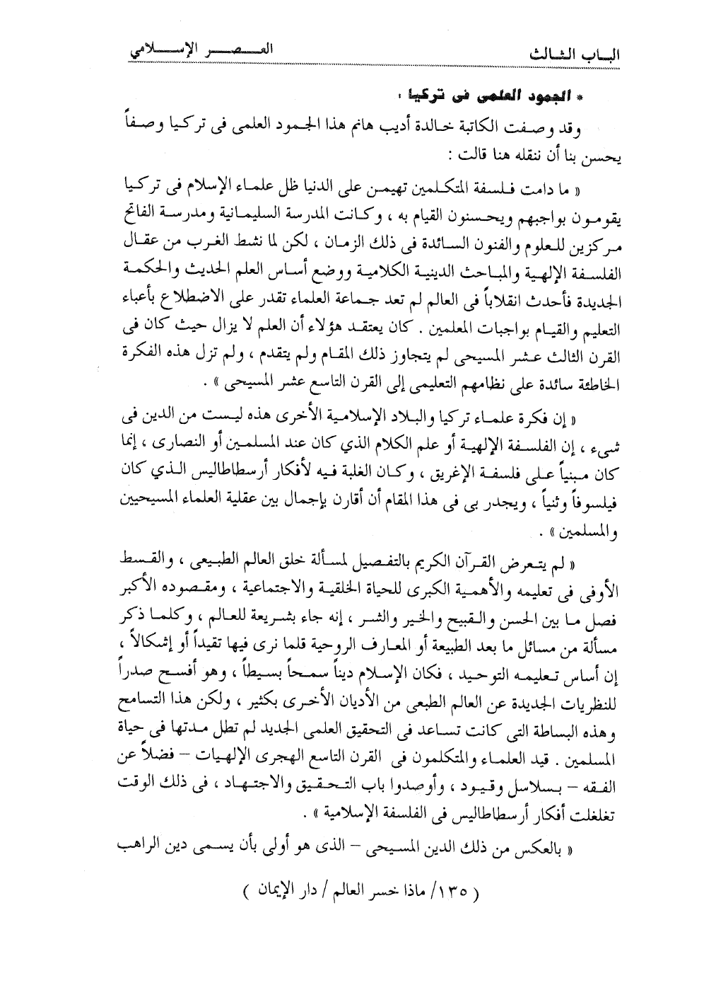 ((ما دامت فلسفة المتكلمين تهيمن على الدنيا ظل علماء الإسلام في تركيا يقومون بواجبهم ويحسنون القيام به، وكانت المدرسة السليمانية ومدرسة الفاتح مركزين للعلوم والفنون السائدة في ذلك الزمان، لكن لما نشط الغرب من عقال الفلسفة الإلهية والمباحث الدينية الكلامية ووضع أساس العلم الحديث والحكمة الجديدة فأحدث انقلاباً في العالم لم تعد جماعة العلماء تقدر على الاضطلاع بأعباء التعليم والقيام بواجبات المعلمين. كان يعتقد هؤلاء أن العلم لا يزال حيث كان في القرن الثالث عشر المسيحي لم يتجاوز ذلك المقام ولم